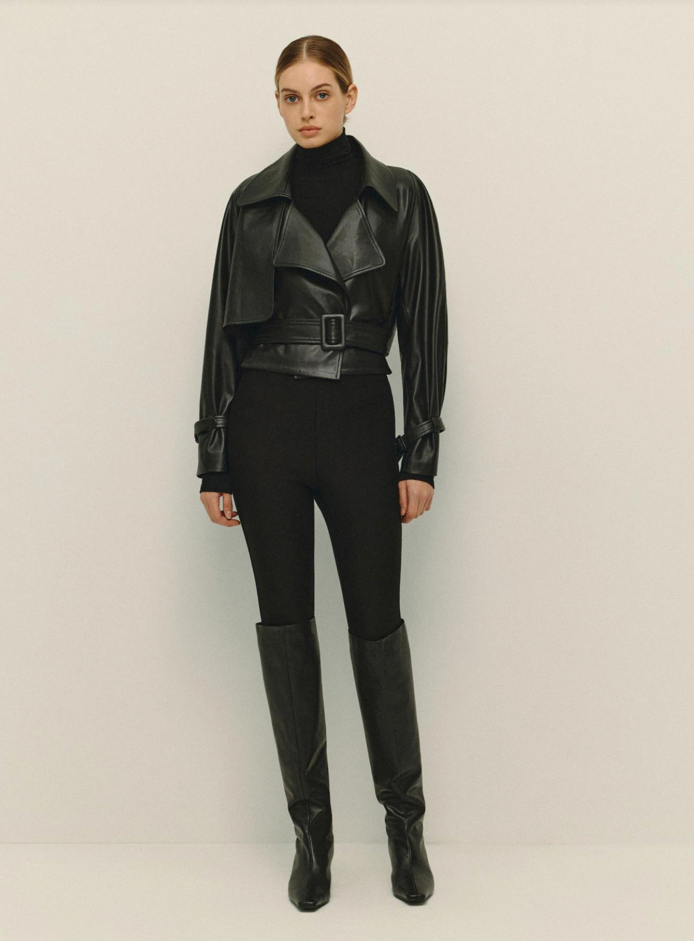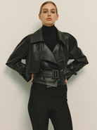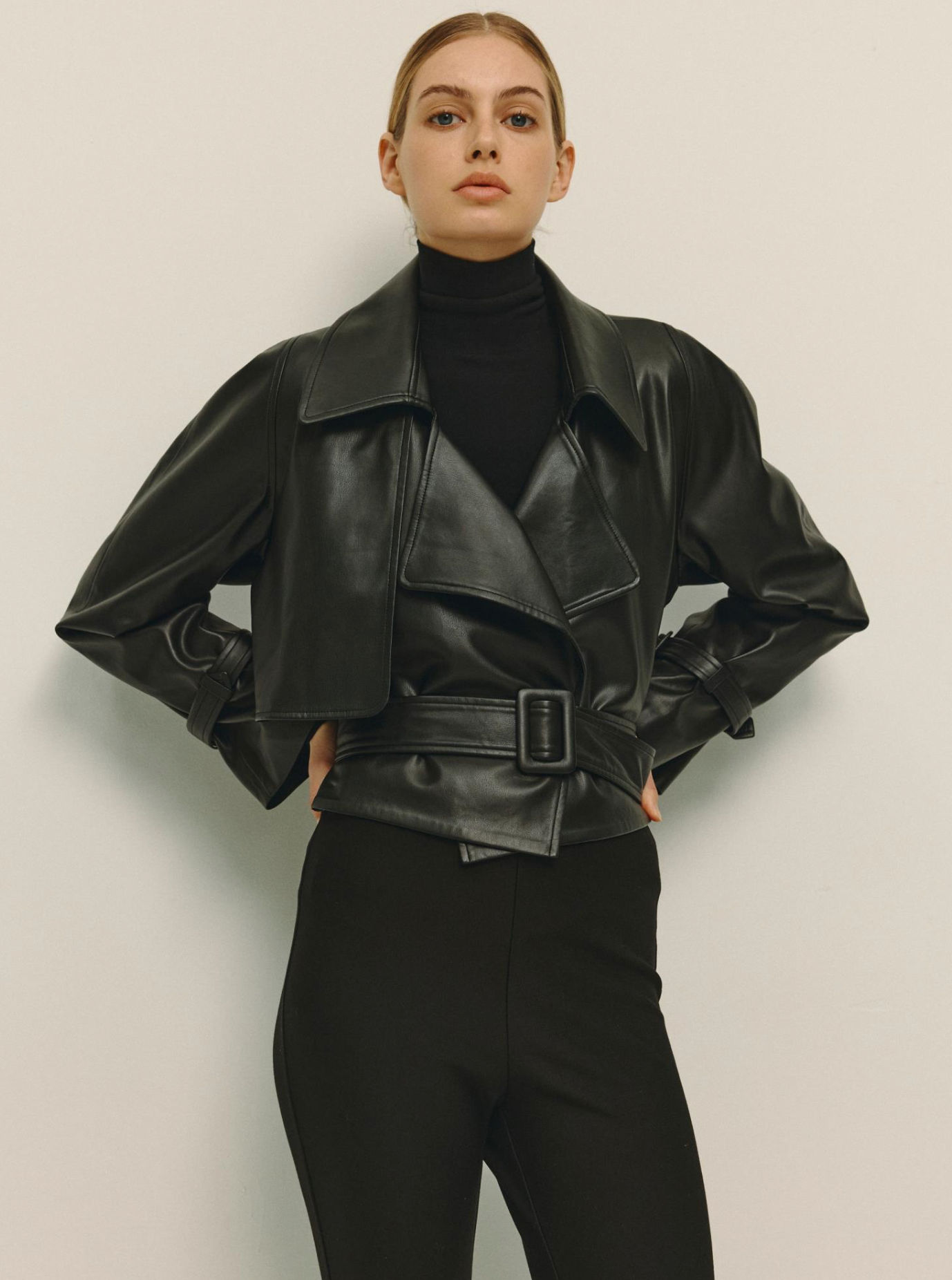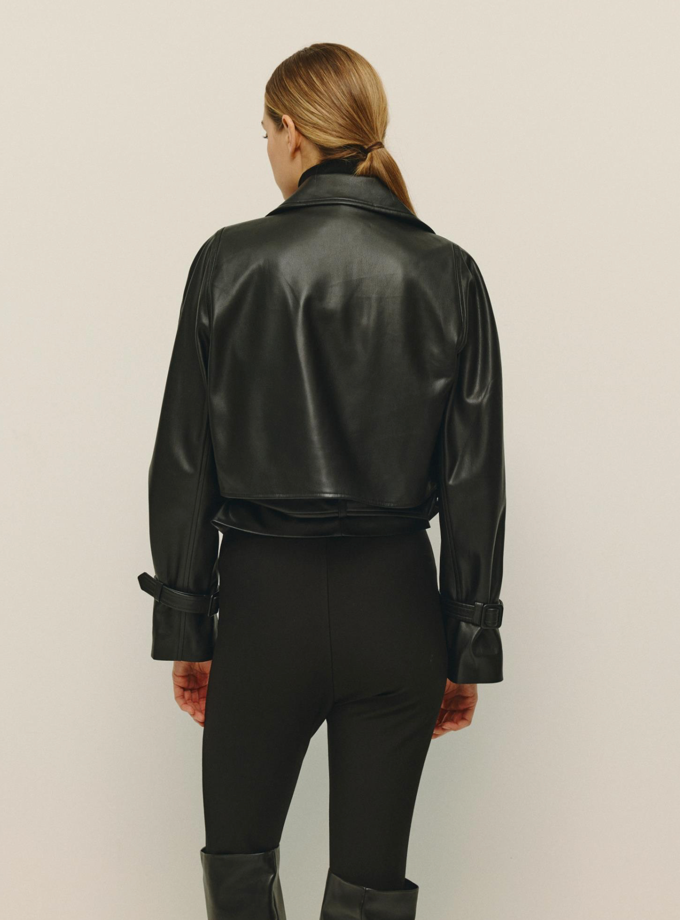 The CHARLES Vegan Leather Crop Jacket offers a stylish, cinched fit that highlights your waist for a flattering silhouette. Made from premium vegan leather, it’s a cruelty-free choice that pairs effortlessly with high-waisted bottoms, making it perfect for elevating any casual or dressy outfit with confidence and edge.