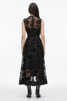 Dark romance meets utilitarian edge. This sleeveless dress is crafted in sheer devoré organza with tonal floral motifs, framed in sleek satin trim throughout. Shoulder epaulets and metal button details add a touch of attitude, while the belted waist and high-low hem create a sculpted, airy silhouette. Comes with a matching slip for effortless coverage. Feminine with a twist—perfect for modern occasion dressing.