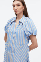 Elegant with a sense of pragmatism, this dress features puff lantern sleeves, adjustable side ties, and a snap front placket for a versatile fit. Cut from our signature technical poplin, it combines crisp structure with effortless movement. The relaxed A-line silhouette is designed to transition seamlessly between occasions, balancing modernity and ease. Style it with flats for casual outings or elevate the look with statement accessories for a polished finish.