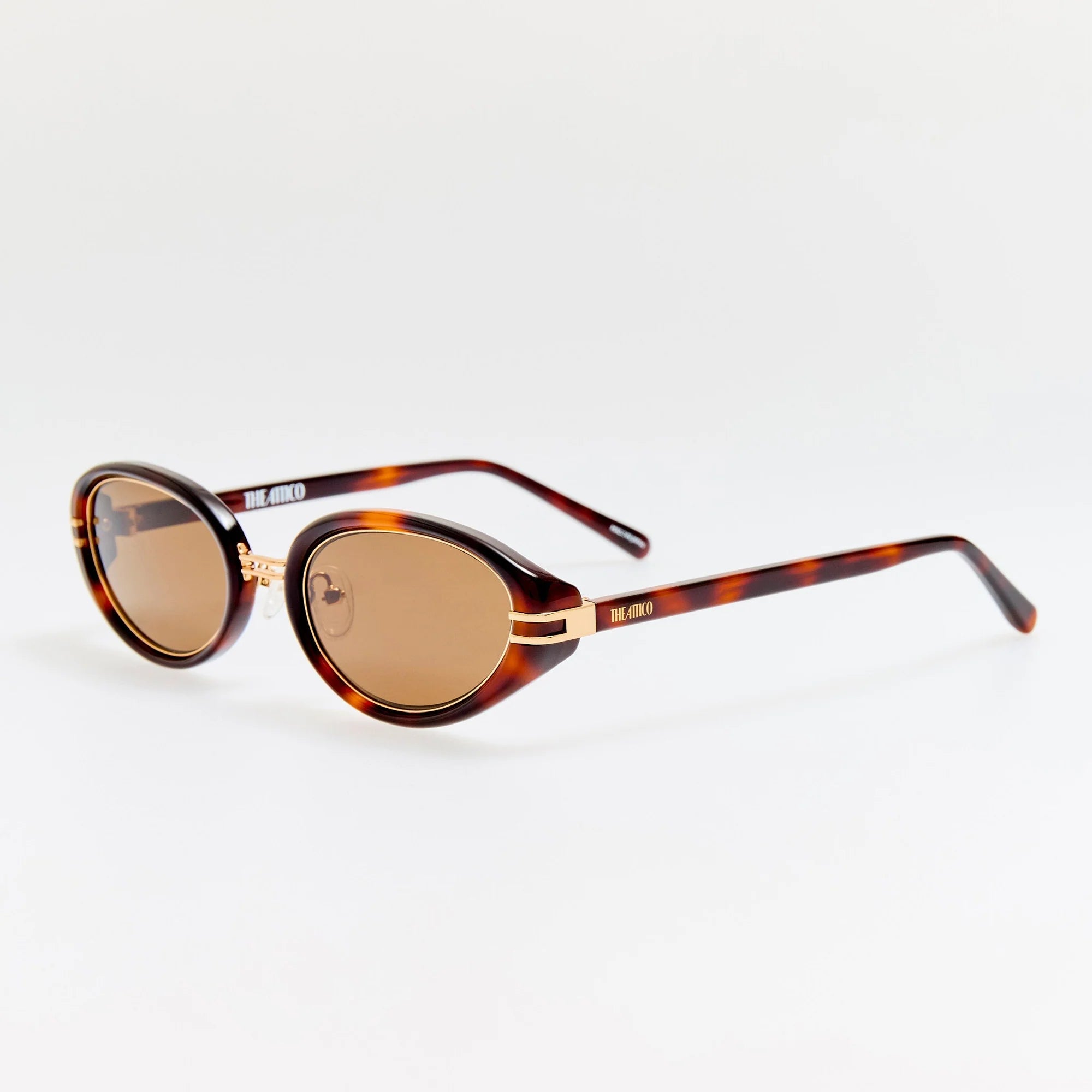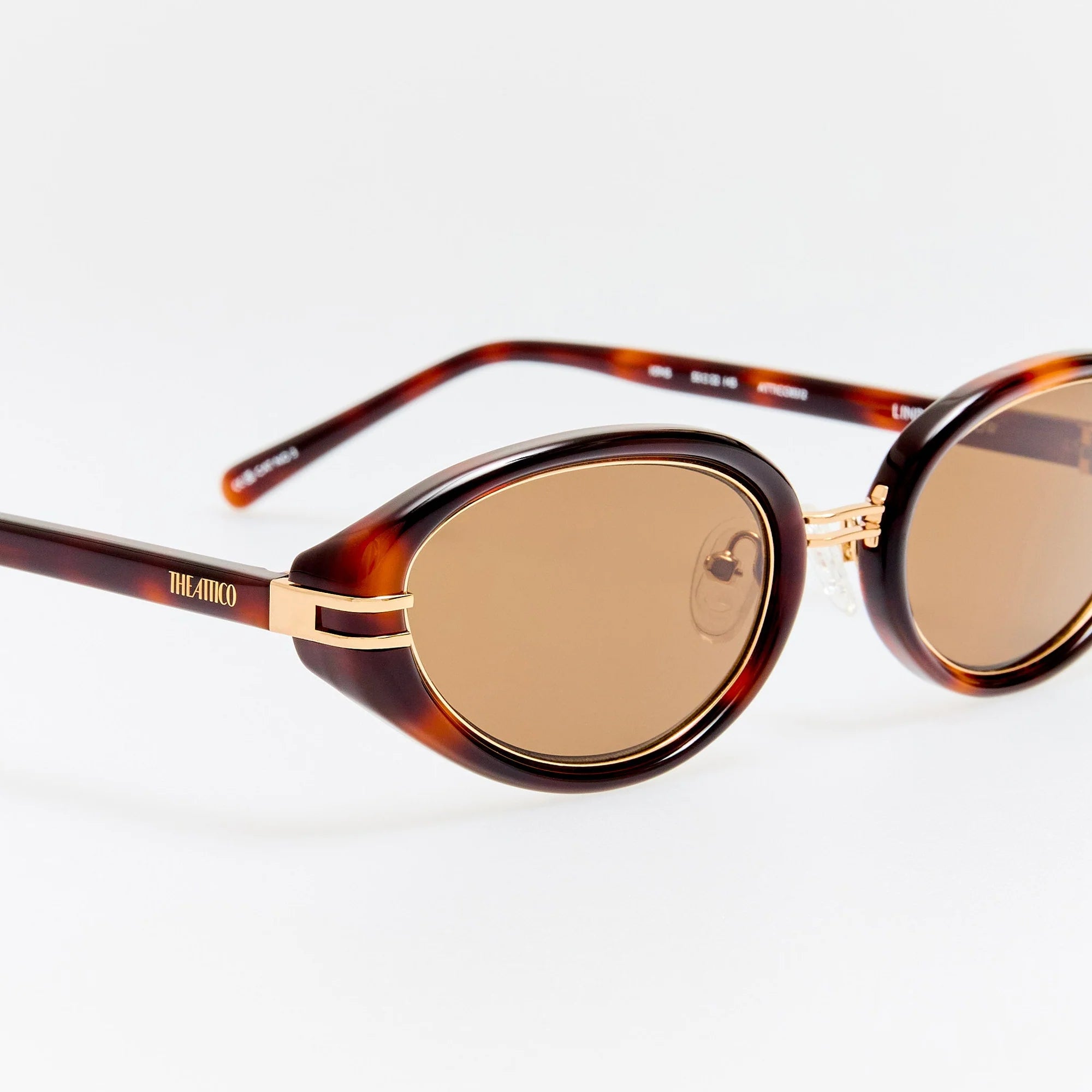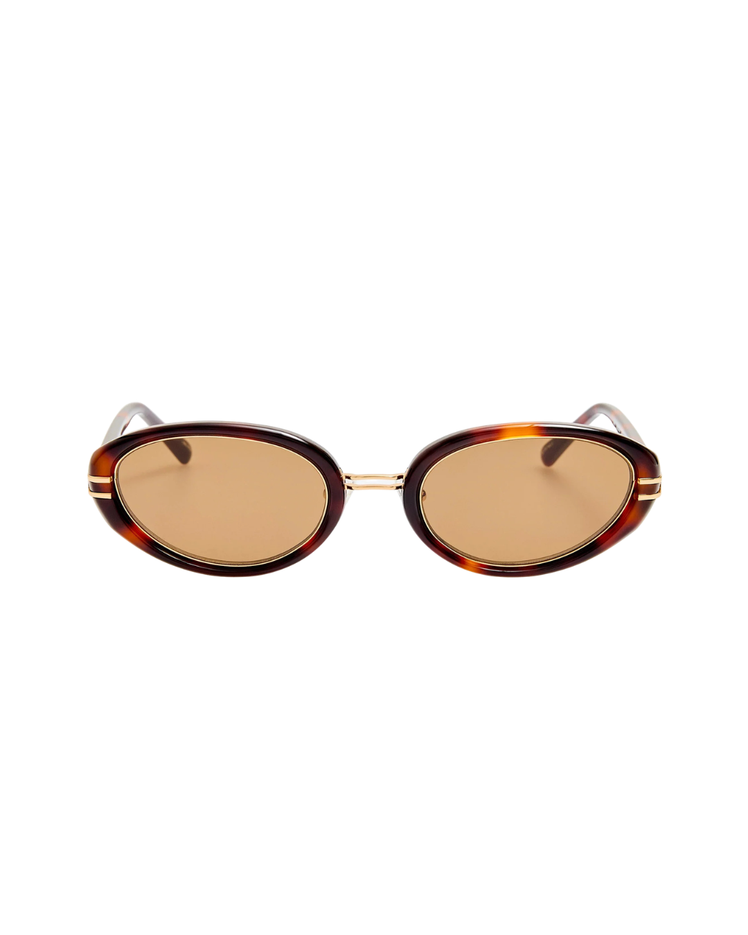 Introducing the Ambra Oval Frame. Crafted from Italian acetate in tortoiseshell this frame is fitted with brown lenses offering full UV protection and adjustable silicone nose pads that offer a tailored fit by allowing bespoke positioning for enhanced comfort. Slim temples are accented with gold branding.