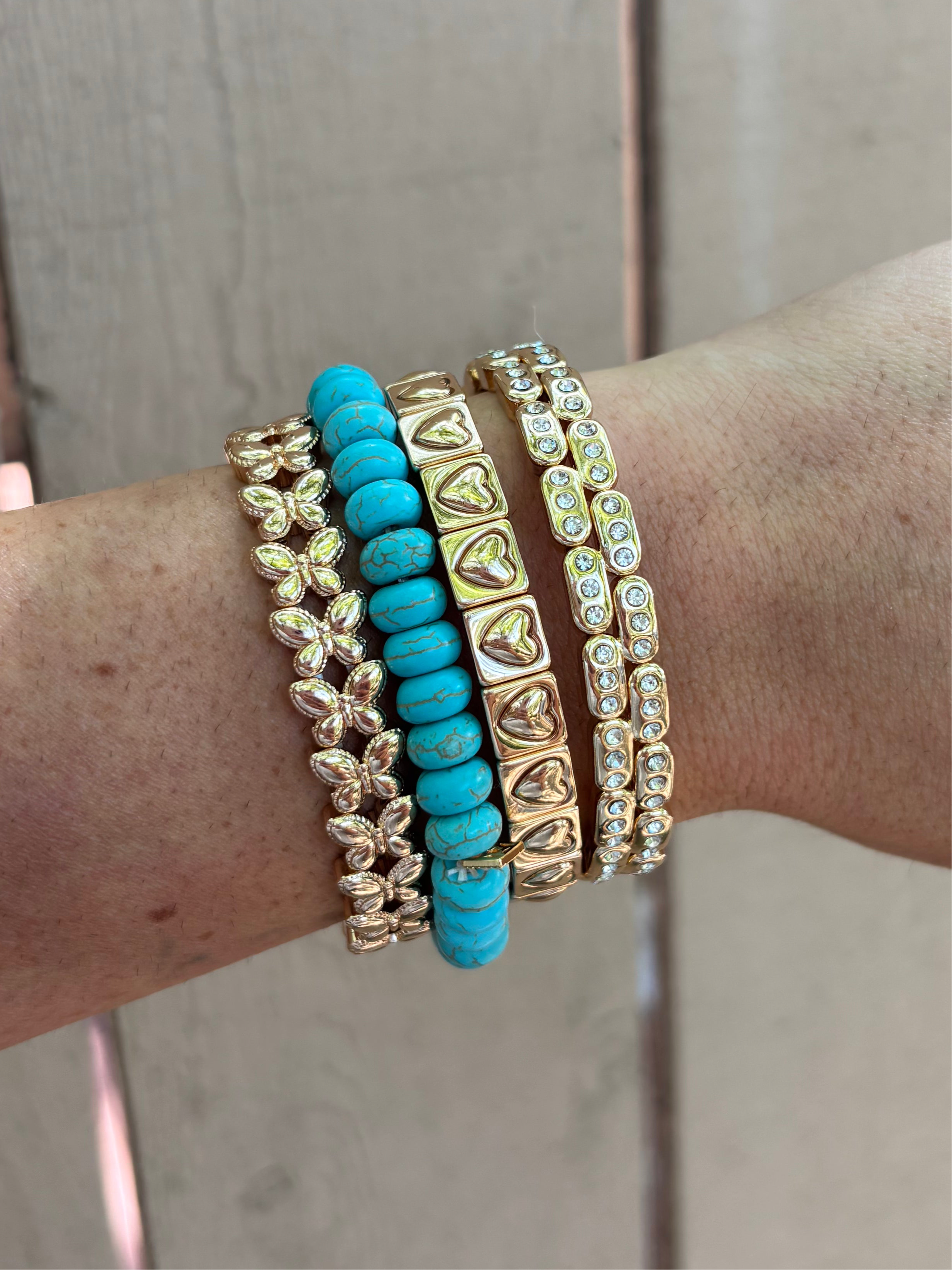 The Bubble Heart Bracelet is hand-crafted using the perfect gold square beads with bubbled up heart shape. We carefully select each color pallet to strike a style for both everyday and special occasions. This bracelet is 7" in length and is a slip-on-style. All of our single bracelets are designed to be stacked or they can be styled to wear alone.