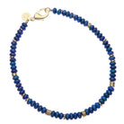 Natural lapis beads make up the body of the necklace with pops of gold beads in between. Clasp is brass with 14k gold plating.