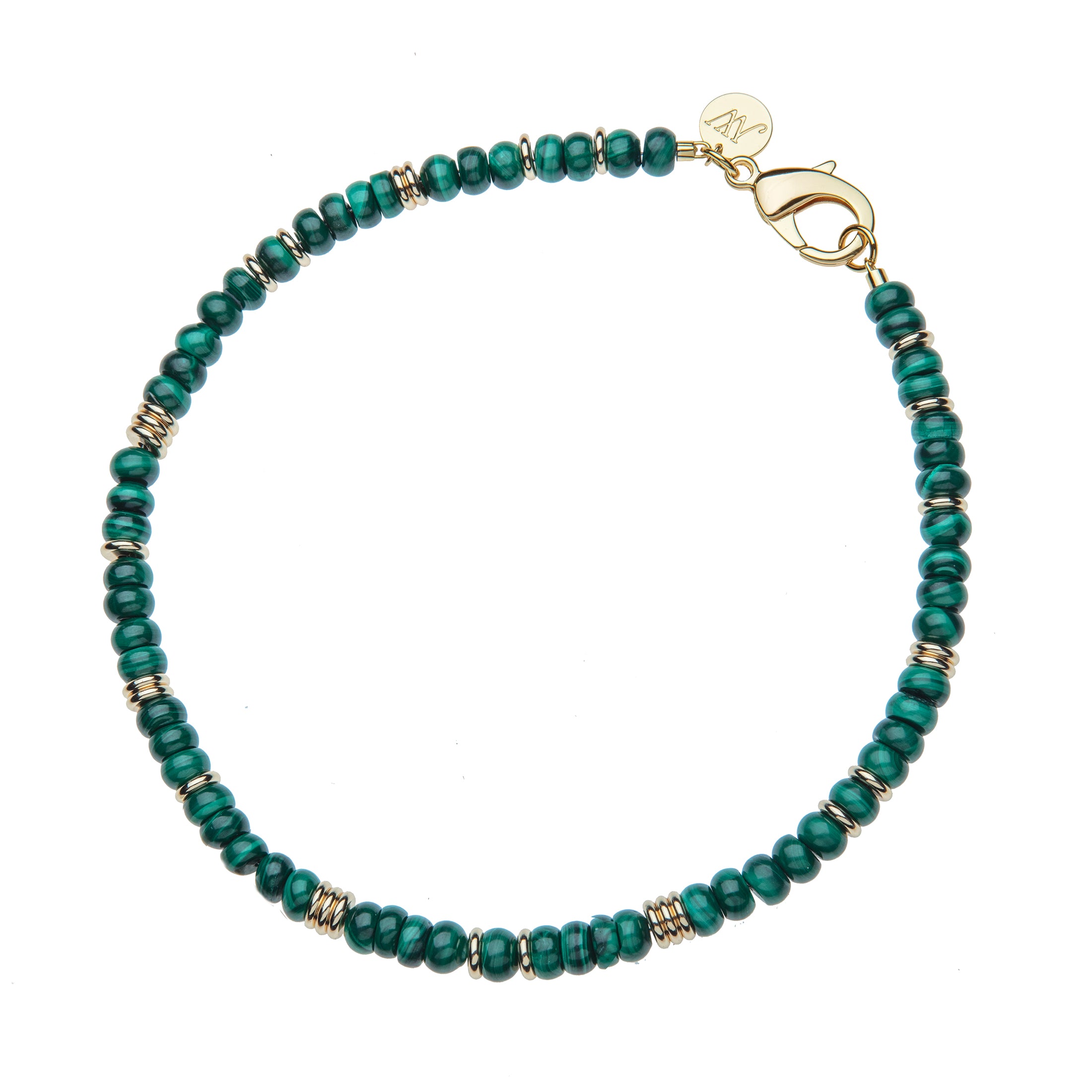 Natural malachite beads make up the body of the necklace with pops of gold beads in between. Clasp is brass with 14k gold plating.