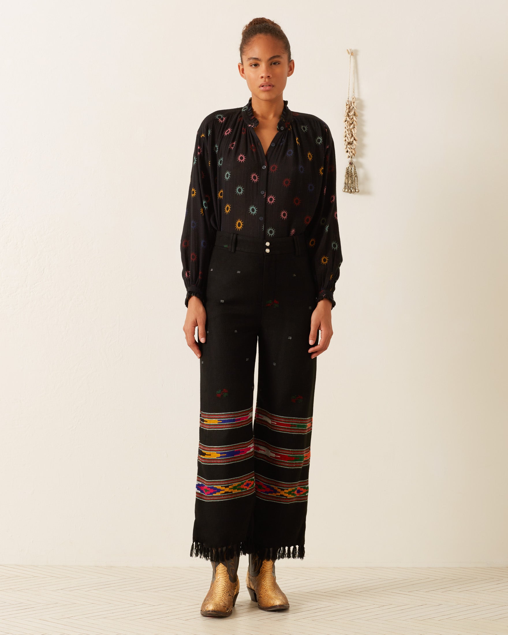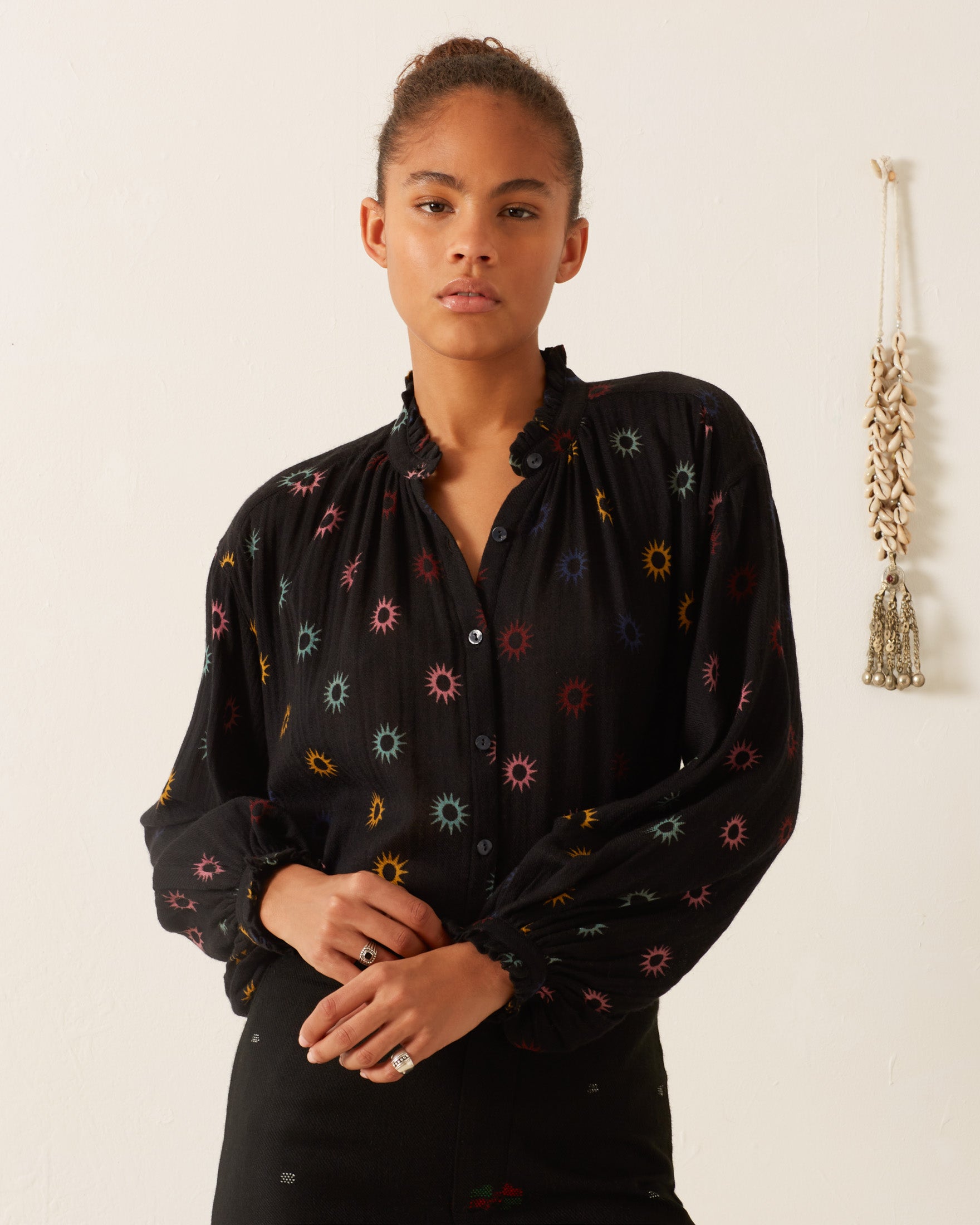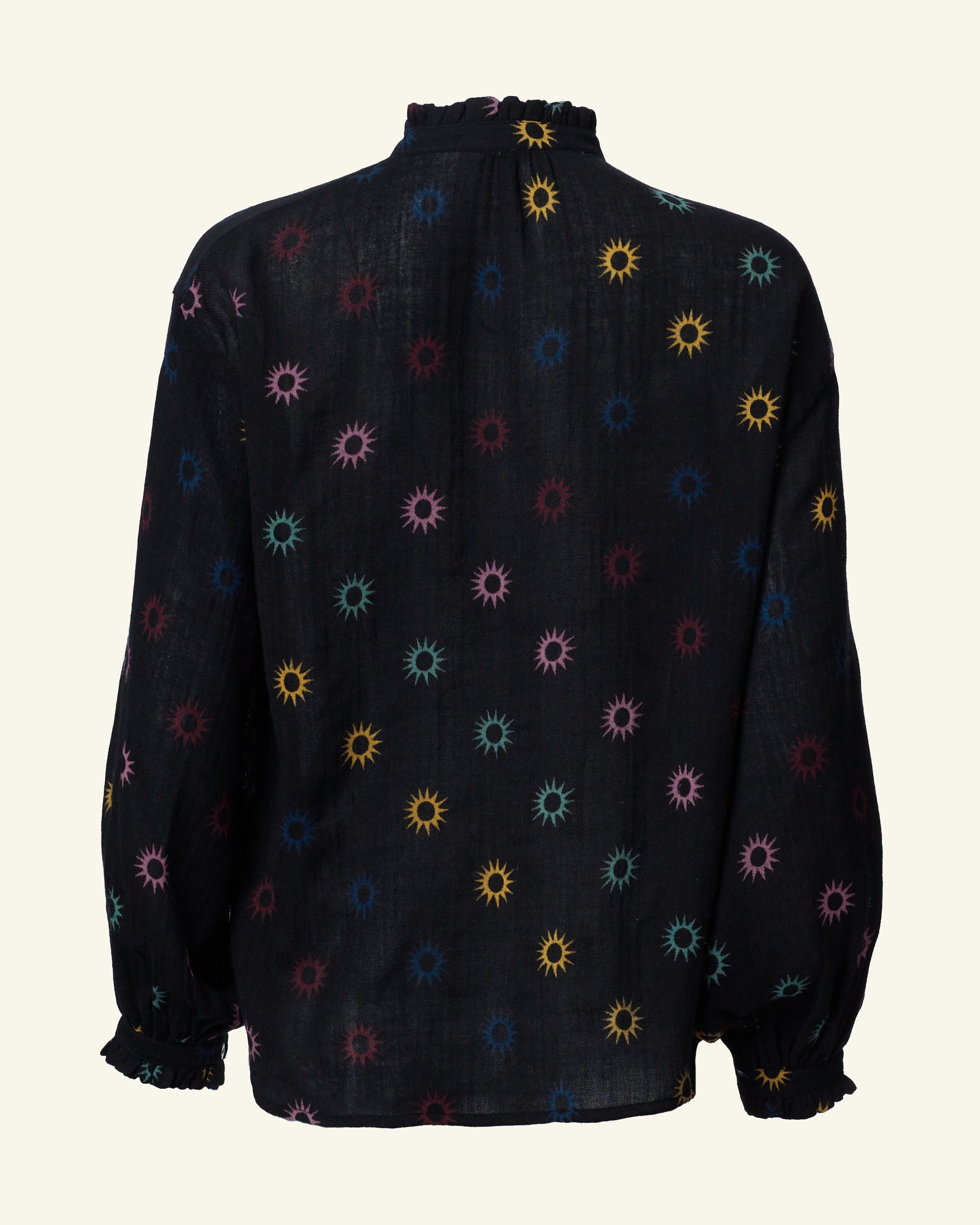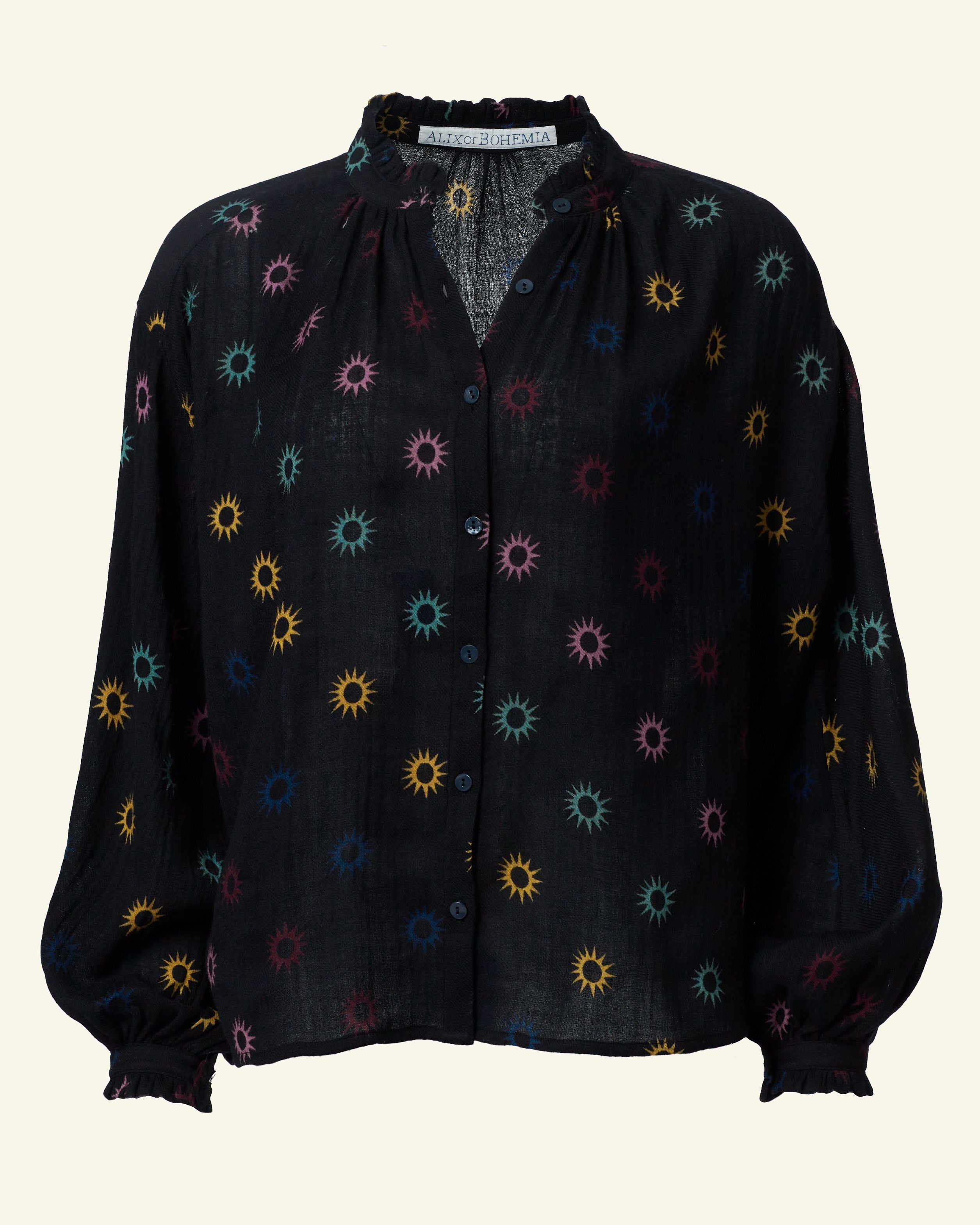 Individually cut by hand and finished with French seams, this sunburst print shirt has a ruffled collar and cuffs, a mother-of-pearl button front, and dramatically gathered sleeves.
