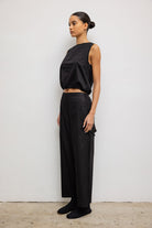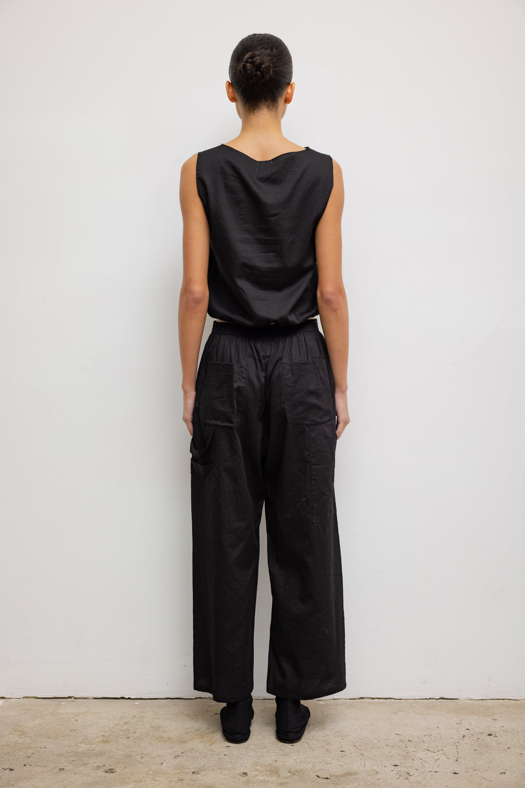 Cut in our bed sheet feel Yoko Cotton, The Yoko Crop Painter Pant a clean, utilitarian silhouette. Featuring patch pockets, an elastic, ruched back waistband, and hammer loop detail.
