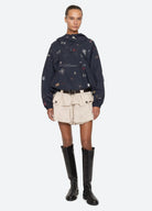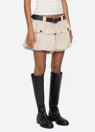 The Andrea workwear bubble shorts feature oversized front pockets and a playful bubble hem. A removable leather belt completes the look, combining practical utility with modern sophistication.