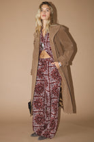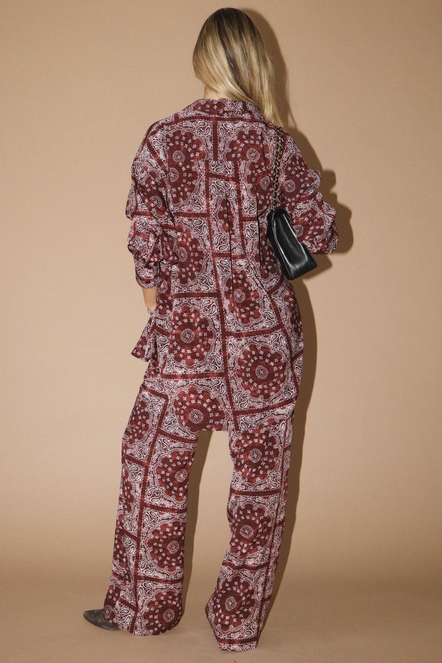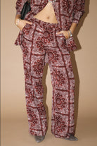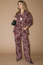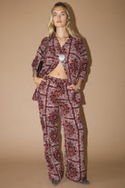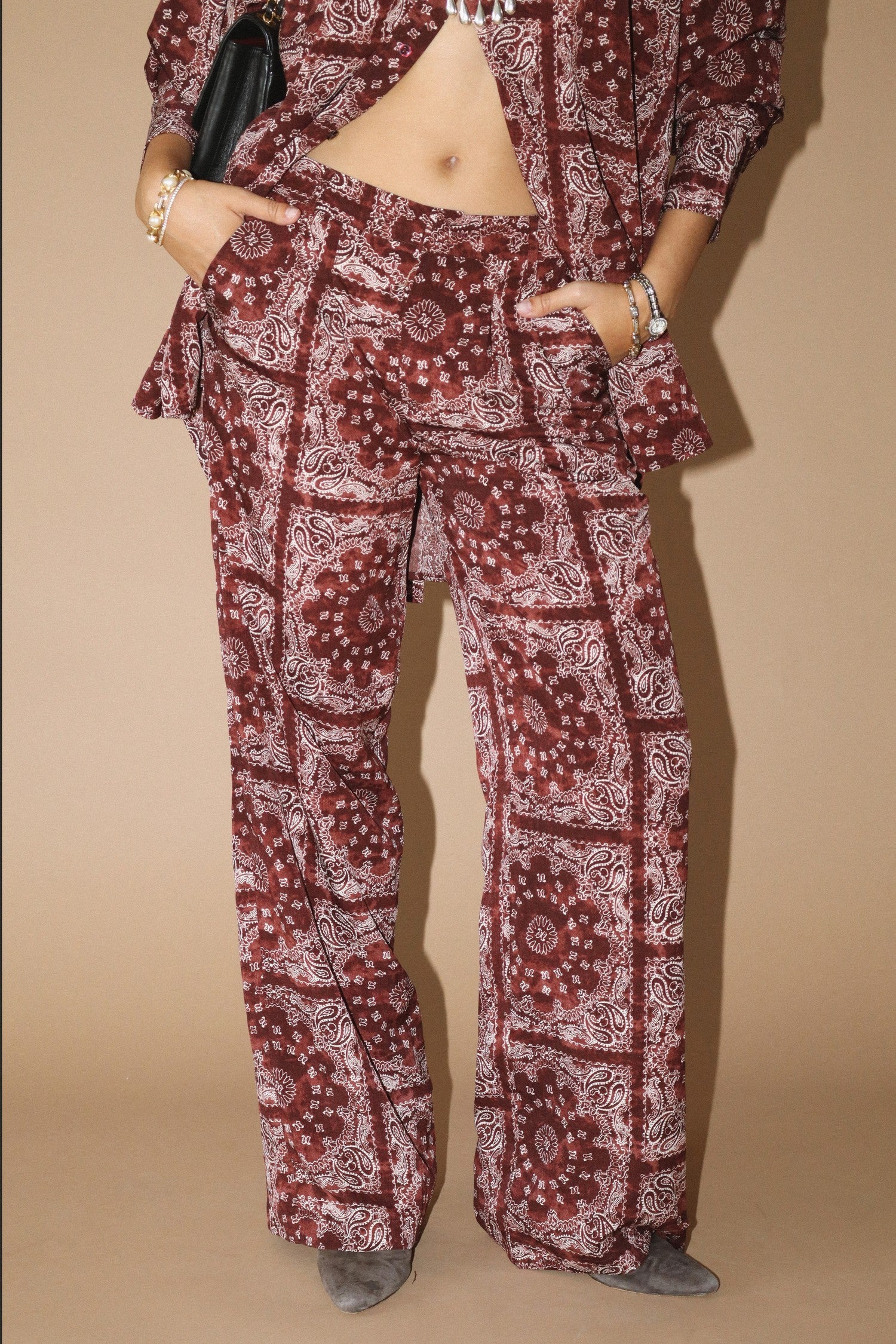 Elevate your wardrobe with these striking wide-leg trousers, featuring an elegant bordeaux paisley print that brings timeless sophistication to any ensemble. Designed with a relaxed, flowing silhouette, they offer both comfort and refined style—perfect for layering or wearing as a statement piece. Part of a coordinated set, these trousers pair seamlessly with complementary pieces to create a polished, put-together look. The rich color palette and intricate pattern make them a versatile addition to your collection, whether you're dressing up for an occasion or elevating your everyday style.