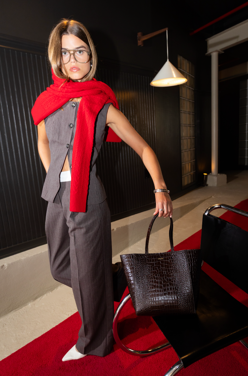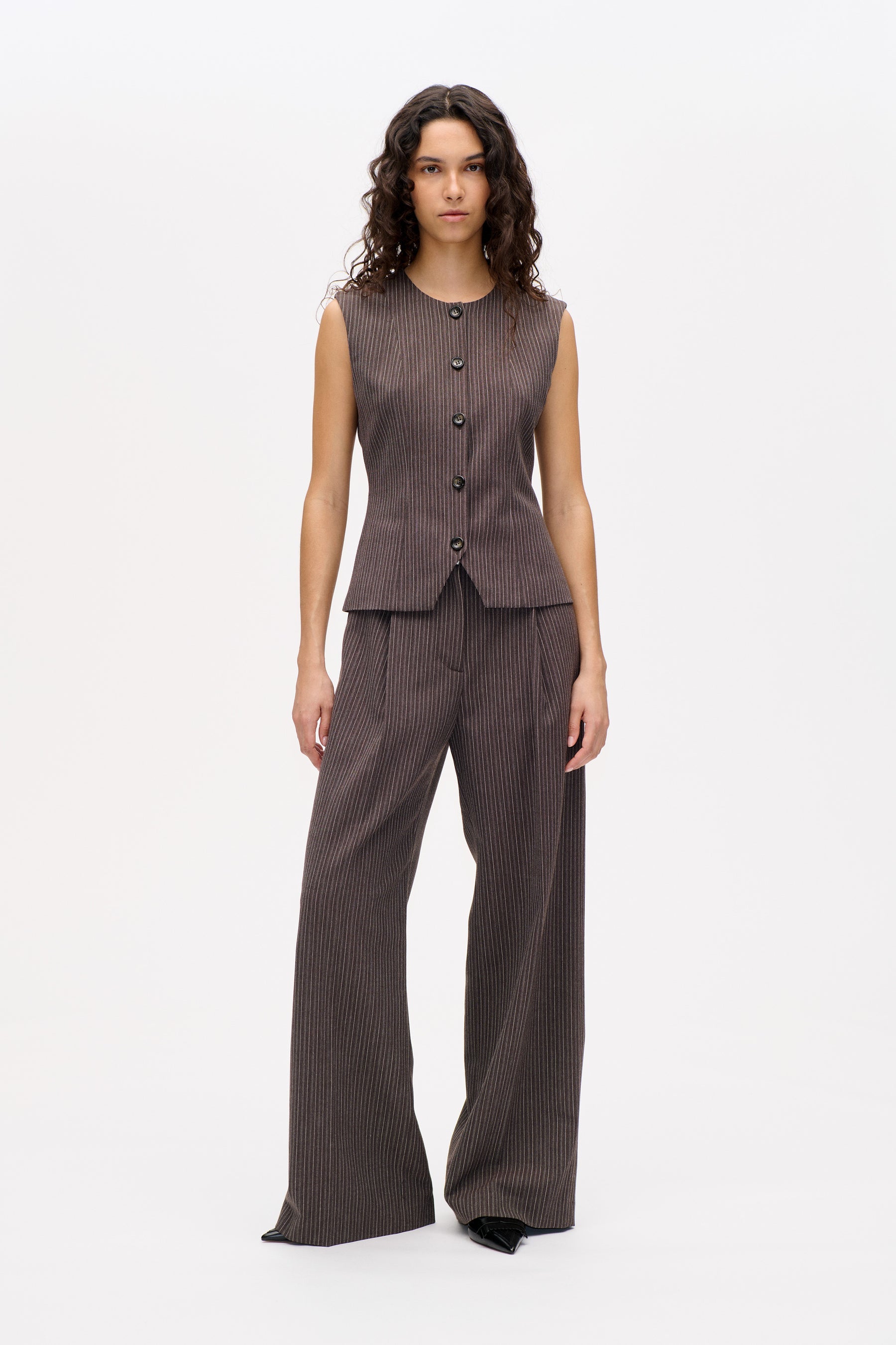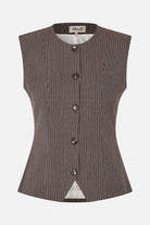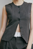 The Menea Top is the perfect pinstriped suit vest for any occasion. The feminine vest has a figure-hugging fit with crew neck and classic button closure for a timeless yet modern design. Style it jeans or a skirt for a cool everyday look or pair it with our Neyat Trousers for an elegant work wear outfit.