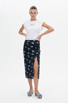 This midi-length, high-rise skirt features a zip closure at the side and a long slit in the front. There is a lining to the knee and jacquard detailing throughout.