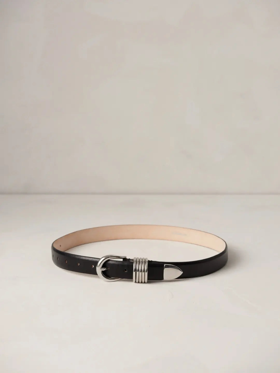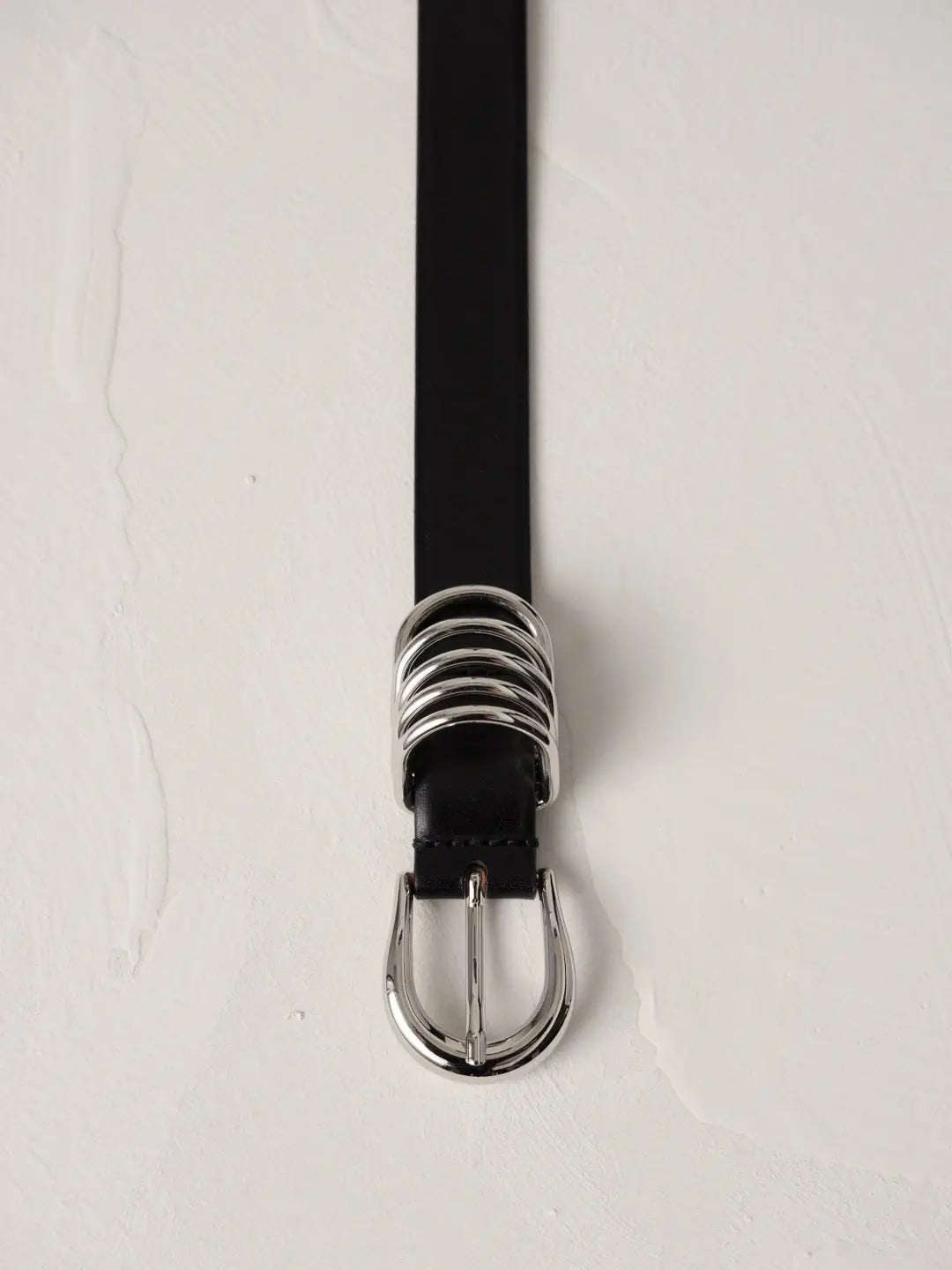 The debut style of Déhanche radiates a subtle yet sophisticated aesthetic that encapsulates the essence of polished dressing. The 3-ring belt is handcrafted in Italy from smooth, luxurious calfskin leather and signature beige suede lining. The shining silver hardware buckle, rings and belt-tip add polish to any look.