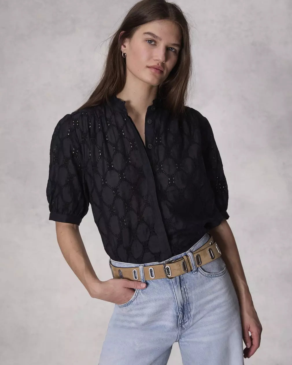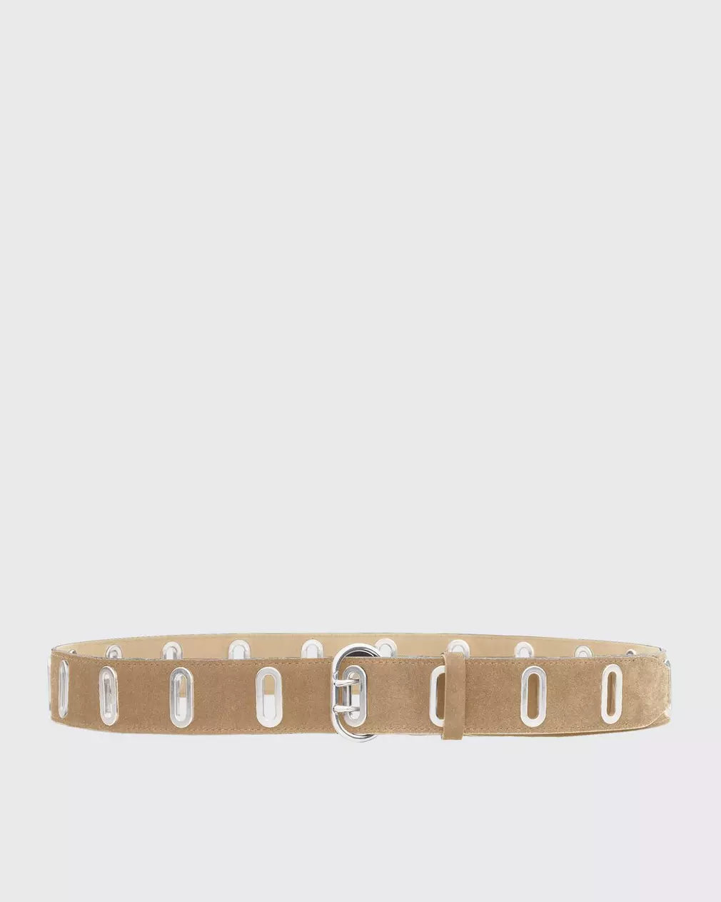 The River. Encircled in oval eyelet details for an adjustable fit, this belt is crafted from velvet soft Italian suede.