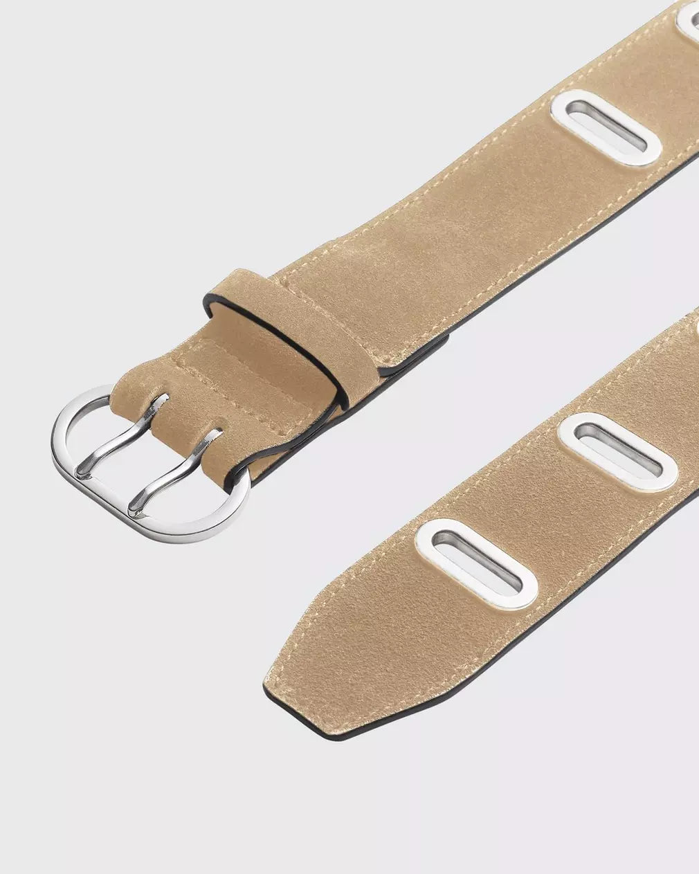- Oval buckle with oval eyelet detail along strap