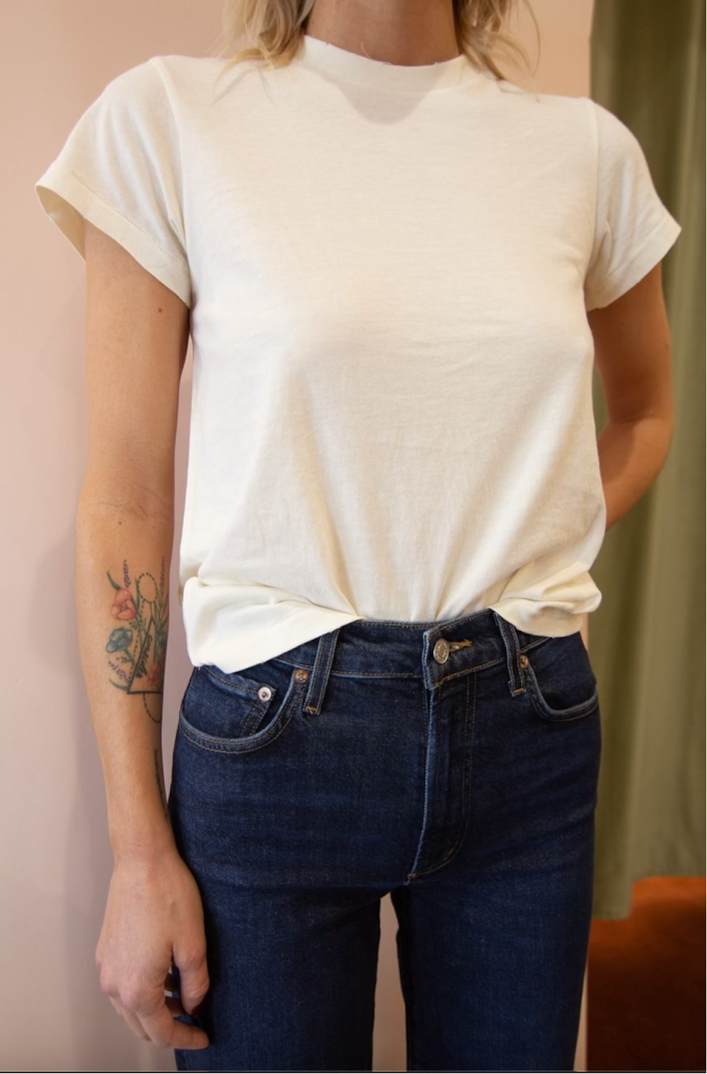 A Clairvaux exclusive! The perfect addition into any closet, this cotton crew tee is a true classic. This boyish tee features a crew neck and slim short sleeves. The fabric is a lightweight, perfect for layering.