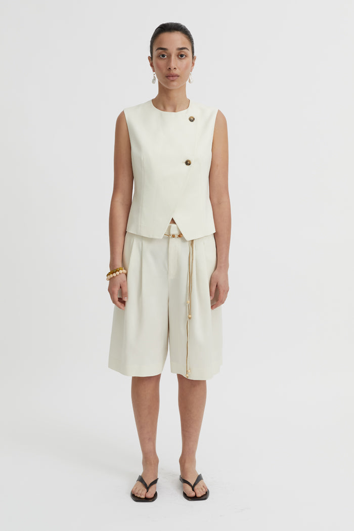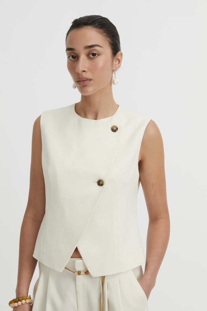 The Junia Vest in Ivory reimagines tailoring through a lens of quiet confidence. Defined by its clean, asymmetrical crossover front and statement button detailing, it offers a sculptural yet understated silhouette. The sleeveless cut and cropped length bring modern ease, making it a versatile piece for both structured and relaxed styling.