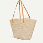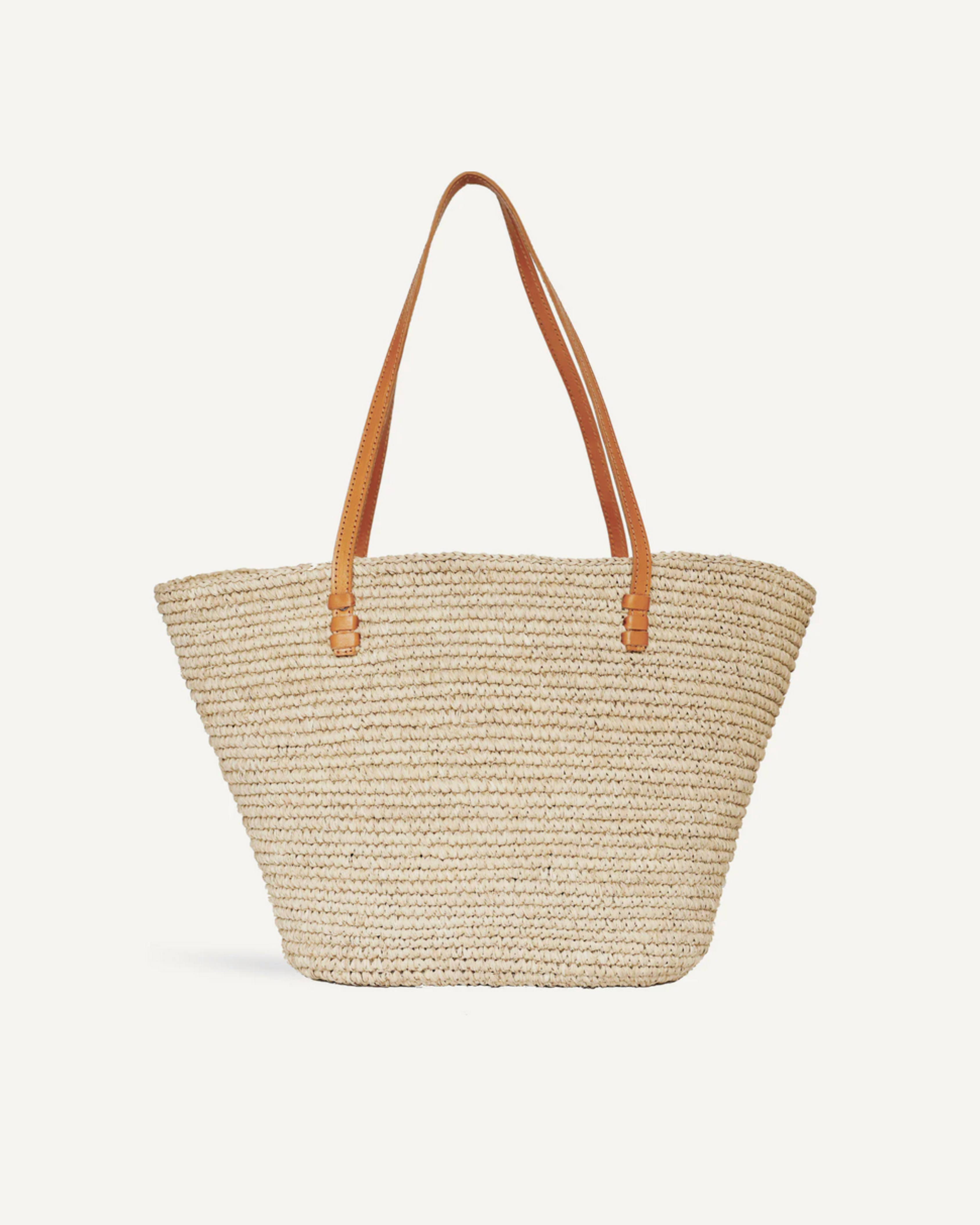 A classic raffia tote with two soft leather shoulder straps. The handwoven base stays upright on the beach (and out of the sand). The roomy interior fits your towel, change of clothes, and water bottle.