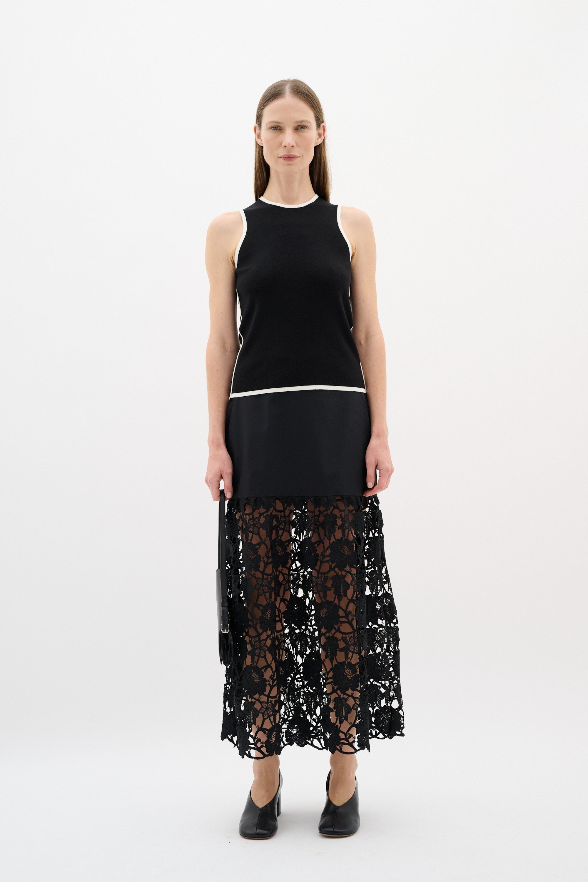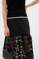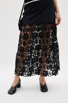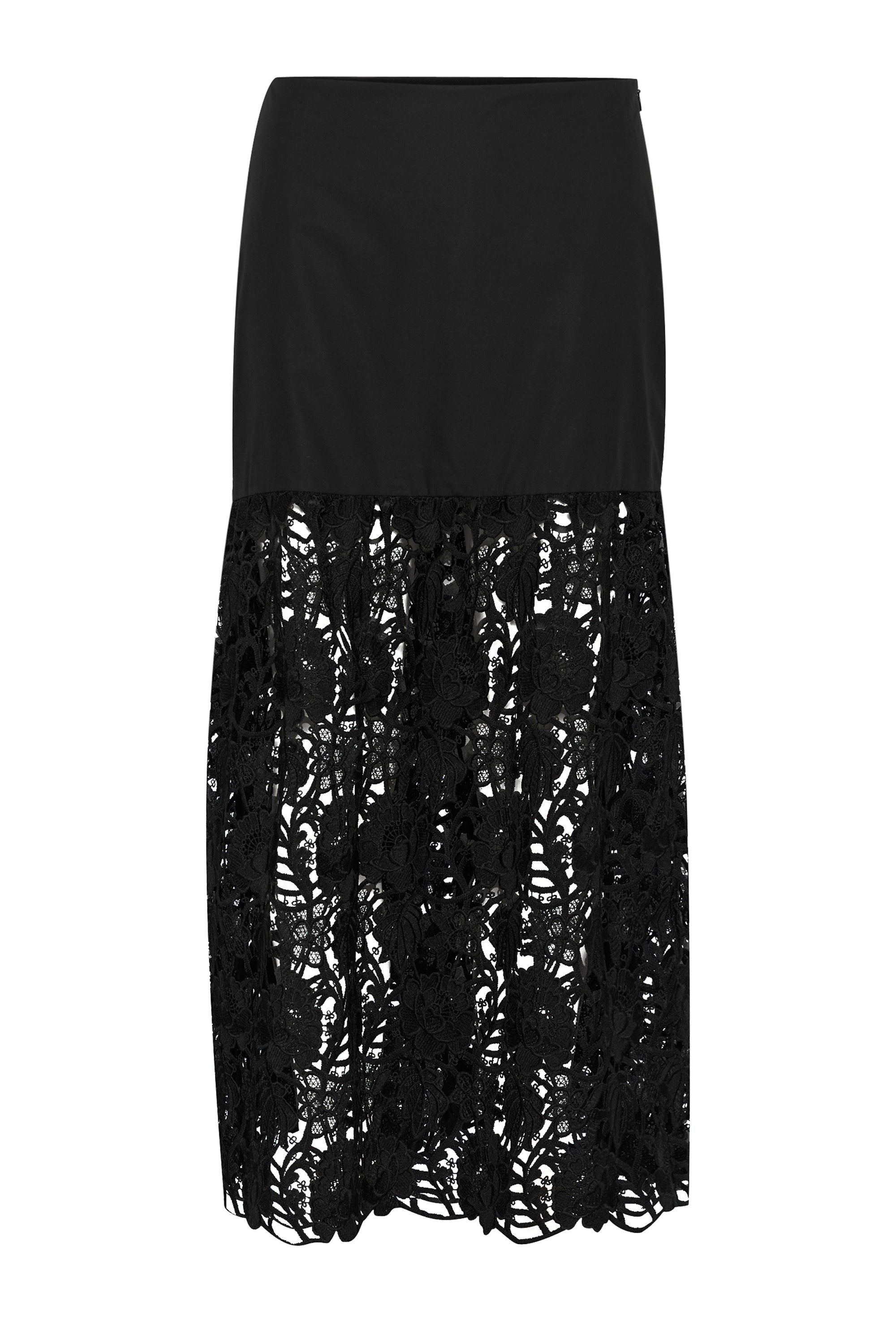 Black midi skirt with a fitted top section and a flared lower part in broderie anglaise. Designed with a clean waistband and scalloped hem. Made from a structured cotton blend with embroidered detailing.