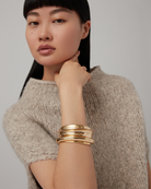 A dramatic statement bangle that boasts deep contours. This custom bracelet opens and closes with a hinge and tab lock closure. To open, push down on the highest point of the clasp before pulling the bracelet open. To close, listen for a "click" to ensure tab is locked properly. Finished in high-polish gold.