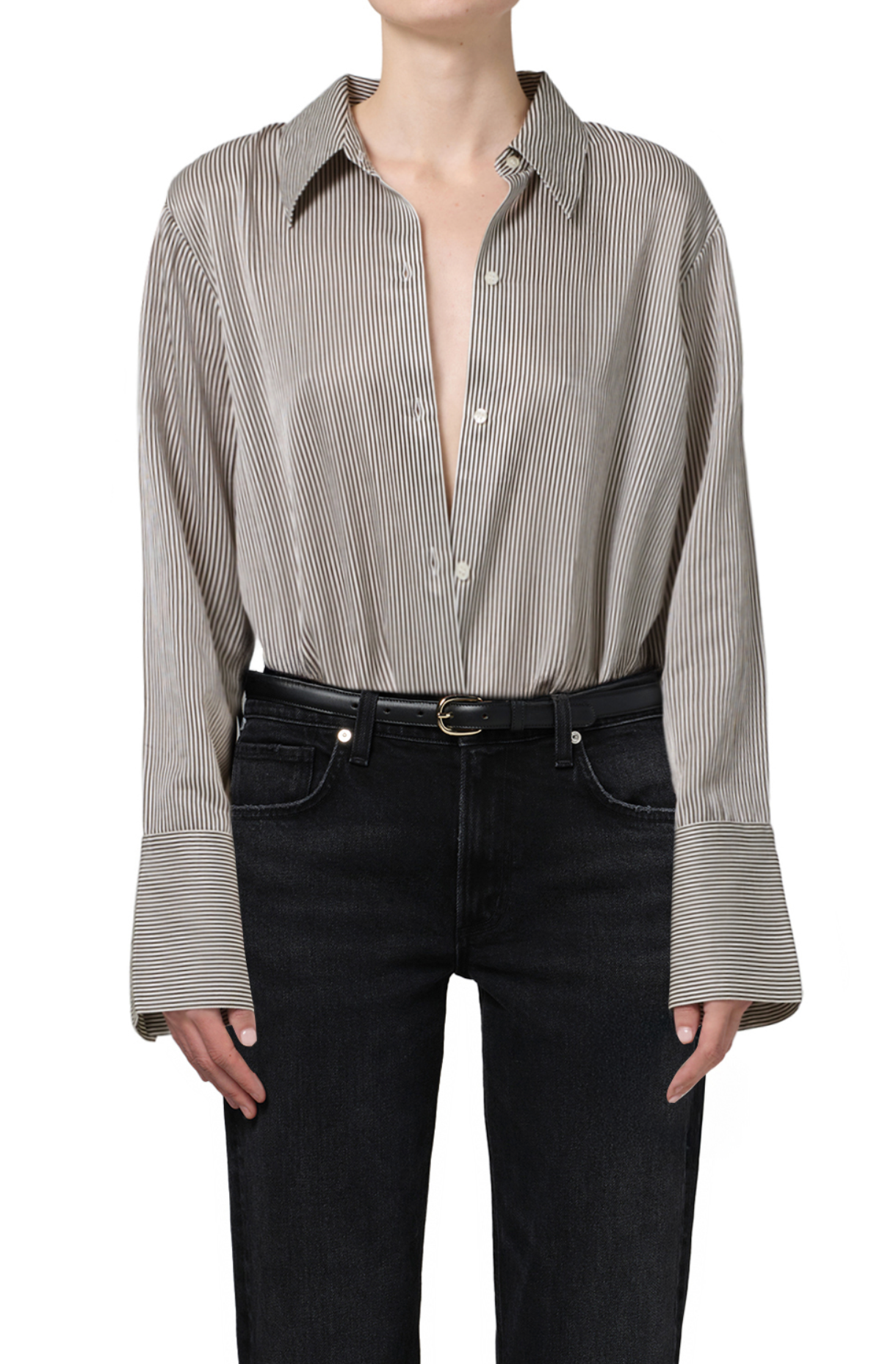 Refined and feminine, the Camilia Shirt is cut from an ultra-smooth cotton-silk blend that drapes effortlessly. The long sleeve silhouette features a clean button front and subtle structure, while deep Midnight blue adds a sleek, modern edge. Perfect tucked into denim or worn loose over tailored trousers.