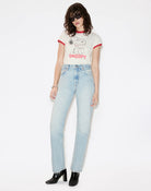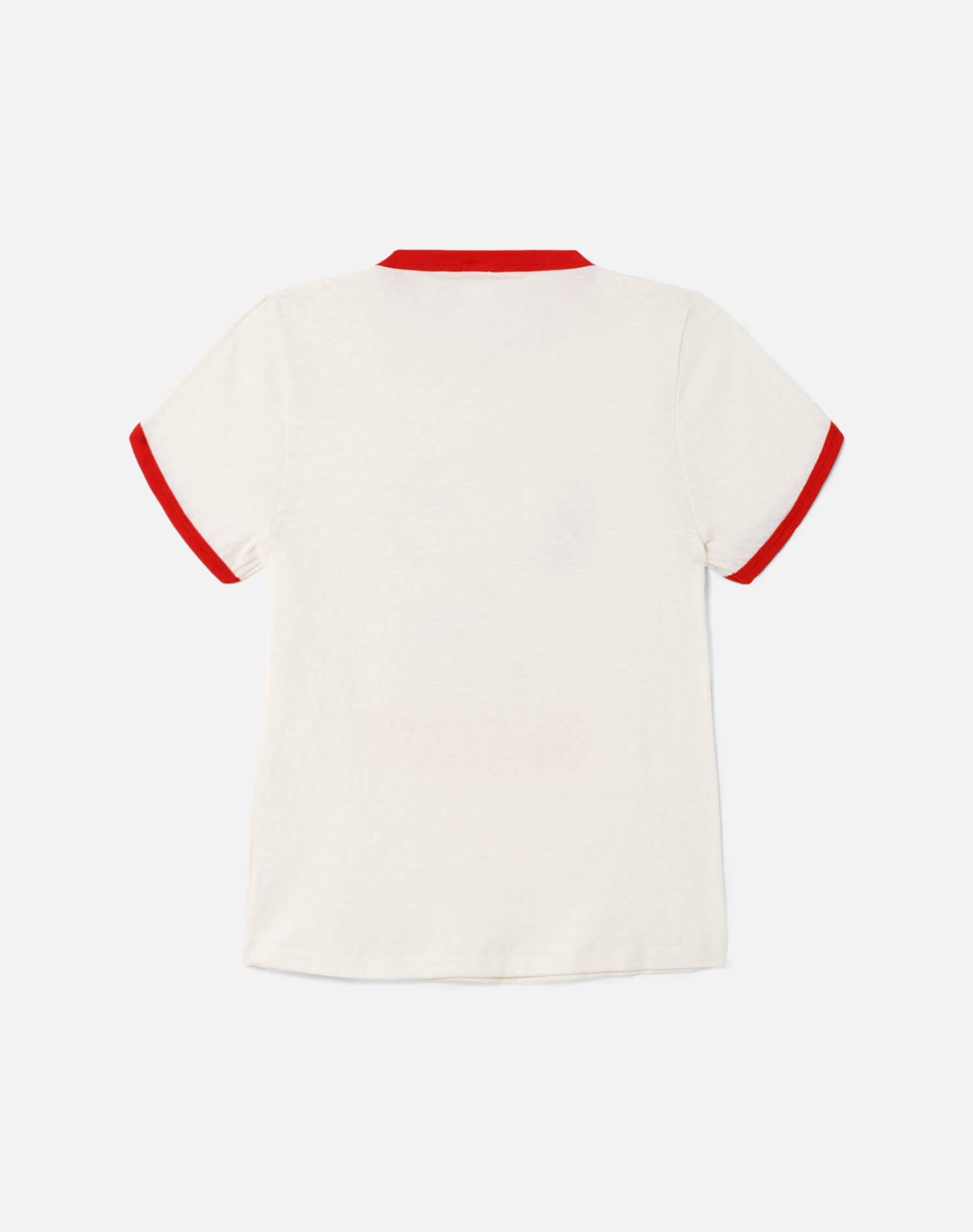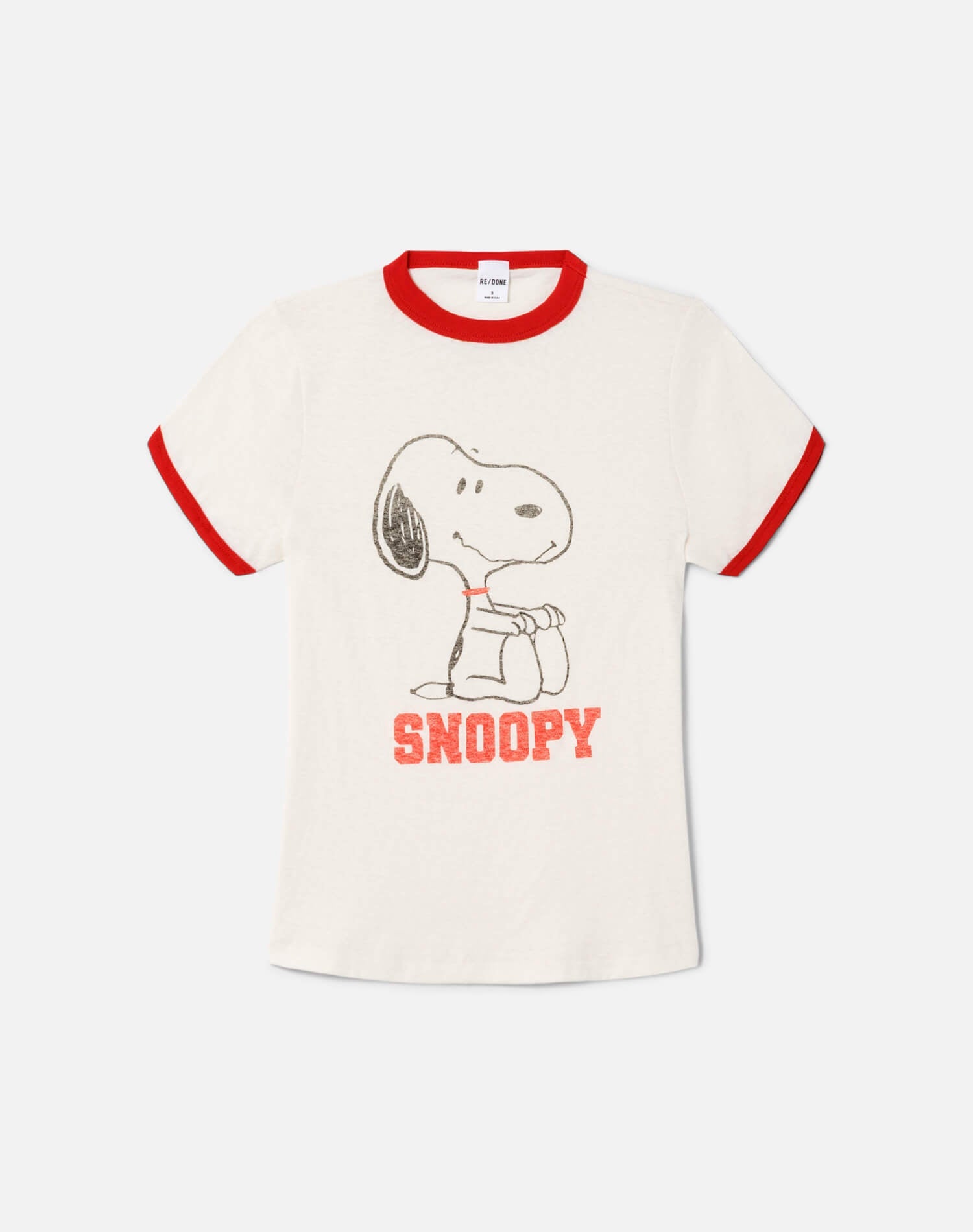The 60s Slim Ringer Tee takes a favorite body from the RE/DONE Classics line and reinvents it with new details and fabric. Crafted from vintage inspired tir-blend jersey with contrast binding at the neck and sleeve. Featuring a collectible vintage inspired Peanuts graphic.