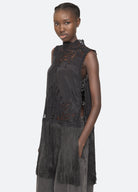 The Adelina lace top features a turtleneck and adjustable D-ring tabs on the sides, adorned with flowing fringe and intricate battenberg lace. Semi-sheer sections of the lace add a romantic quality to this striking, statement-making piece.