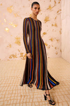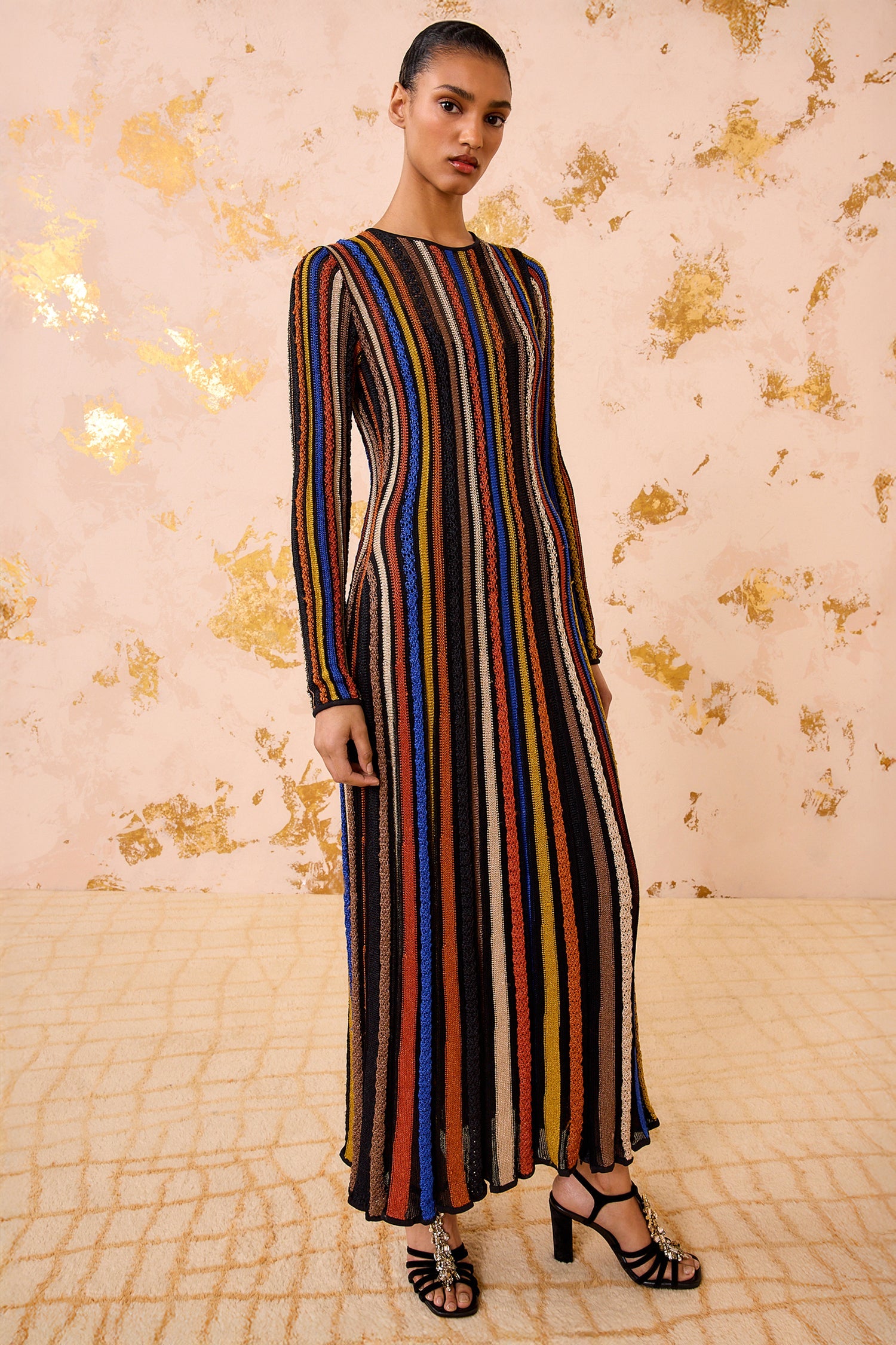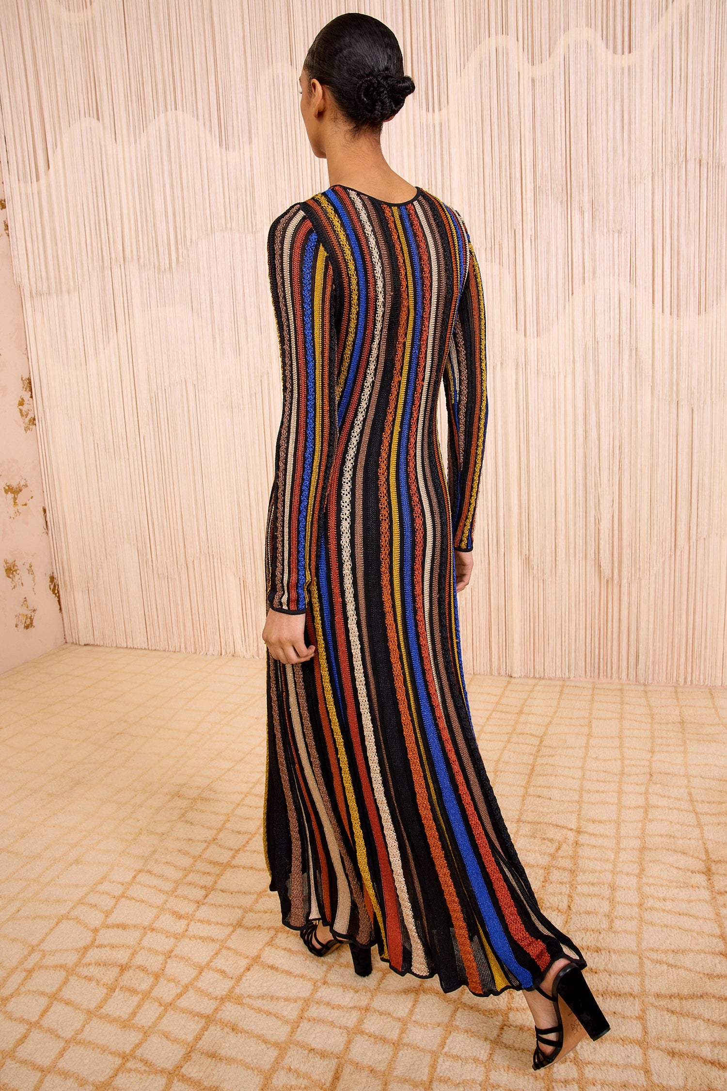 Debuting in Look 28 on our AW25 runway, the Albie Dress features a multicolored, body-skimming silhouette knitted with variegated stitches that add definition to its subtle graphic beauty—note how the stripes expand from narrow in the bodice to full at the floor-length hemline.