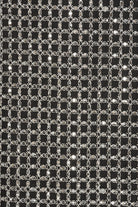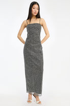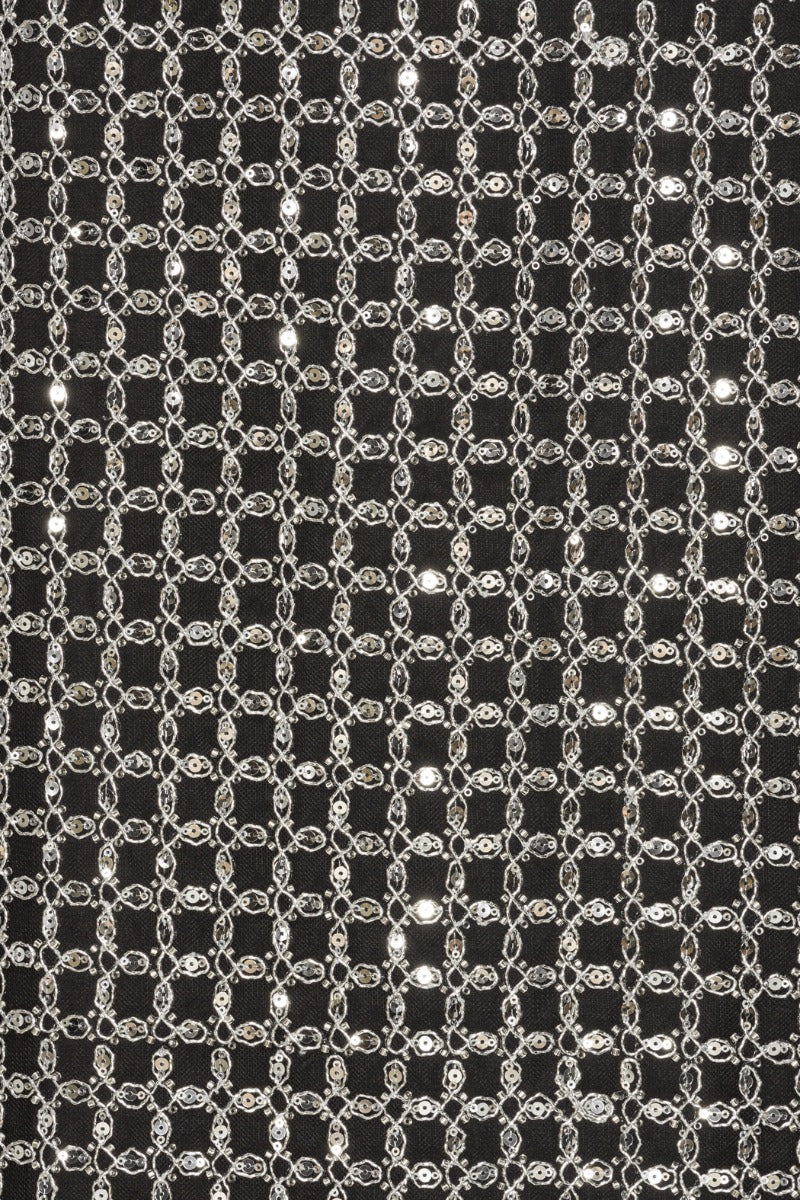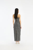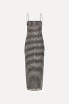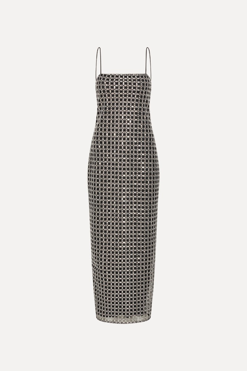 BEADED MAXI SLIP DRESS BLACK IS COVERED IN A GRID OF SILVER-TONED SEQUINS AND BEADED EMBELLISHMENTS. IT FEATURES THIN STRAPS, A SLIM SILHOUETTE, AND A BACK SLIT. THE DRESS HAS A ZIP CLOSURE AT THE CENTER BACK AND IS LINED.