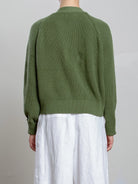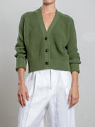 A chunky pointelle detail cardigan made with small batch dyed cotton yarn. Ribbed detailing on neckline & sleeve. Cropped boxy fit.