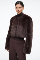 The Casimira Jacket is the perfect holiday layer - a plush faux minx jacket featuring full length sleeves and a cropped length at the waist.