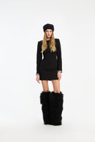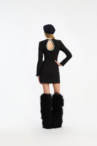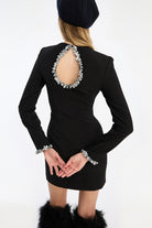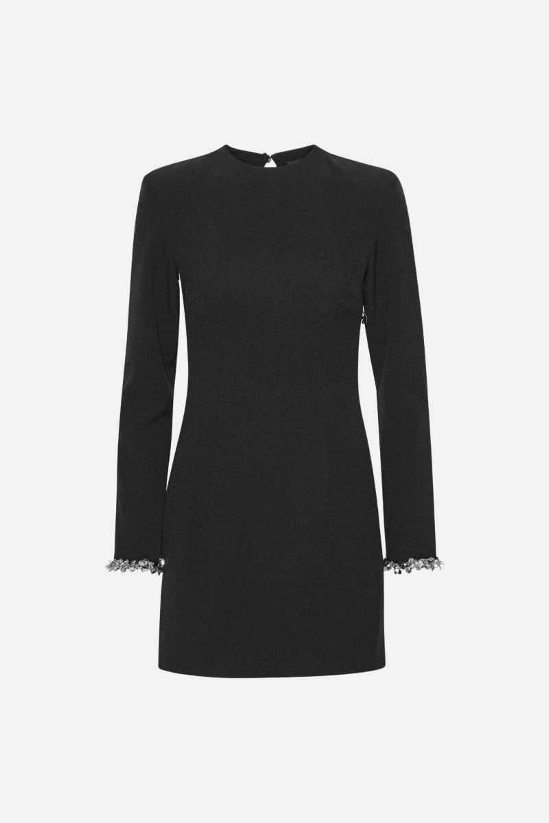 CREPE MINI DRESS BLACK FEATURES A SLEEK SILHOUETTE WITH LONG SLEEVES AND EMBELLISHED CUFFS. THE BACK STANDS OUT WITH A TEARDROP-SHAPED CUTOUT FRAMED IN SPARKLING STONES, ADDING CONTRAST TO THE MINIMAL FRONT. THE DRESS IS MINI LENGTH AND HAS LINING.
