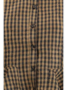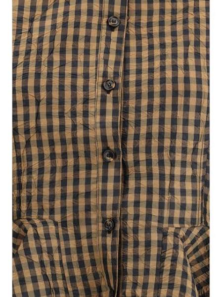 The Blouse in crinkled checked taffeta plays with volume through a graphic, modern elegance. A classic collar and button-front closure keep the line clean, while the silhouette opens into a refined peplum effect: the lower section flares like a sculpted mini skirt, with soft, tiered folds that add movement and subtly define the waist.