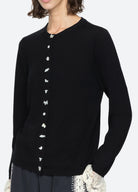 The Diane knit cardigan features intricate folkloric-inspired buttons and detachable lace cuffs, combining artisanal charm with versatile elegance.