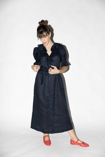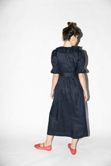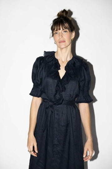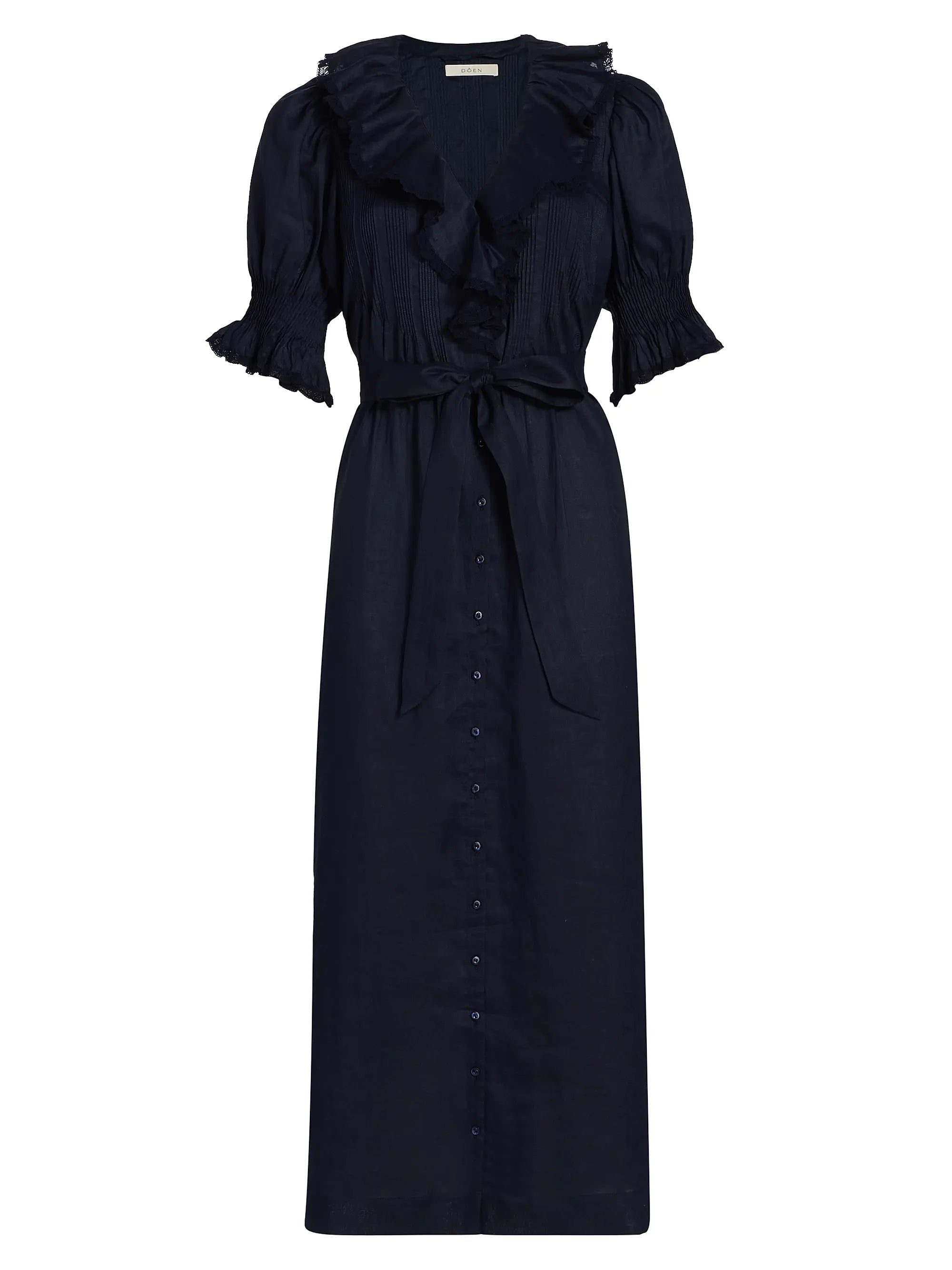 Crafted of ramie, DÔEN's Harriette midi-dress is styled with lace trim adorning the neckline, cascading ruffles, and a self-tie belt.