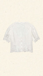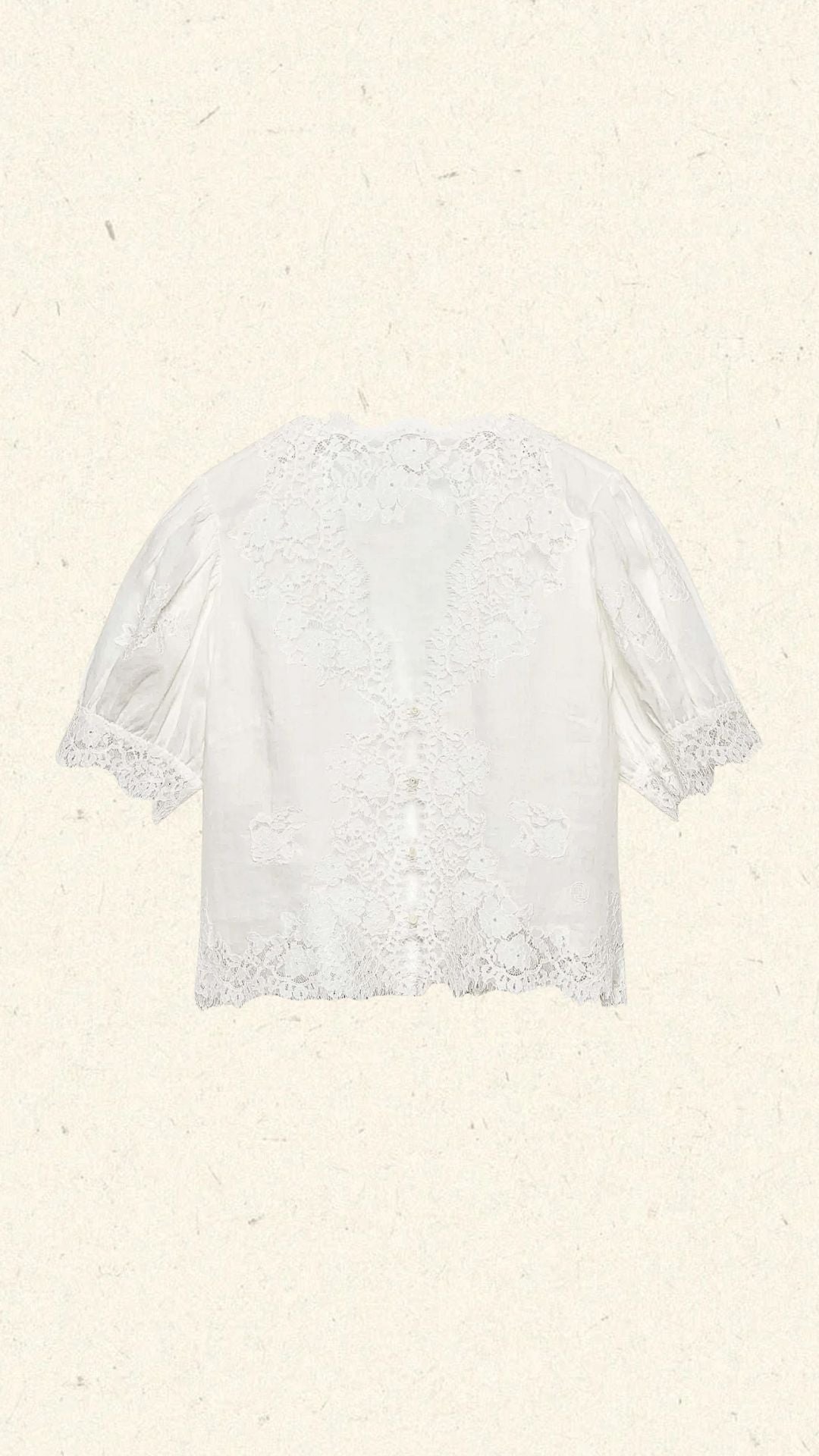 Crafted from crisp, lightweight ramie, the antique-inspired DÔEN Heirloom Idella Top features a plunging V-neckline, short puffed sleeves, and a breezy cut. Intricate embroidered floral lace trims the neckline, sleeve cuffs, center front placket, and slightly cropped hemline, while lace insets adorn the sleeves and bodice. An embroidered “D” emblem finishes the front left hem, and a line of mother-of-pearl buttons extends down the front.