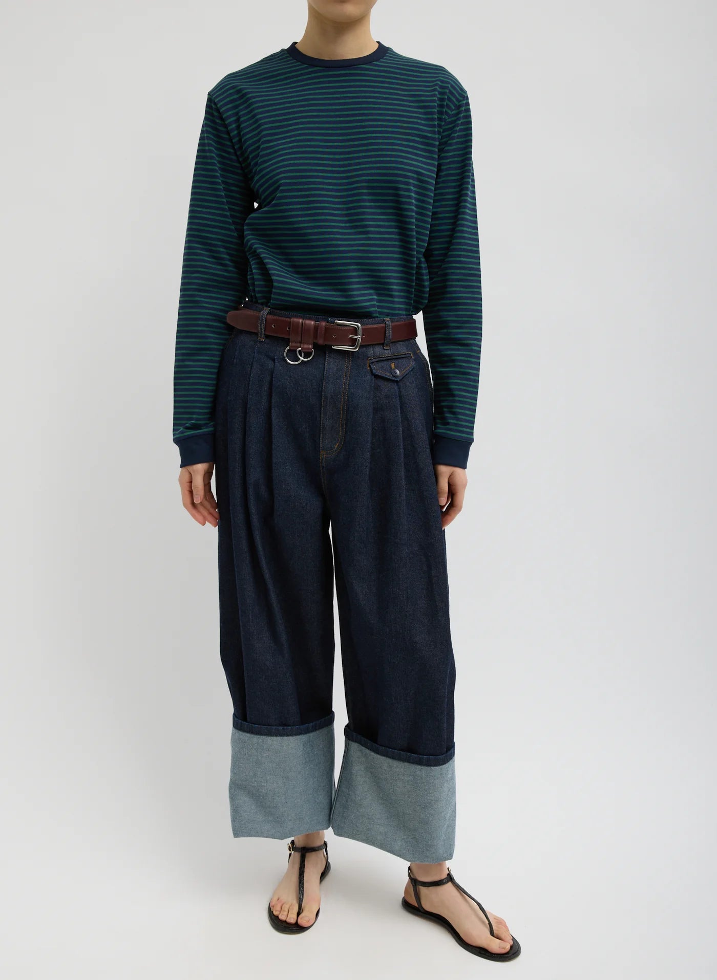The Indigo Denim Triple Pleat Jean reimagines raw indigo denim through a sculpted, wide-leg silhouette. With three adjustable hemline options, this pant adapts effortlessly to your day—merging the structure of tailoring with the ease of denim. A true hybrid design, it brings proportion and polish to every look. Pair it with the Perfect Striped T for an easy take, or dress it up to transition from Play to Work to Dinner with ease.