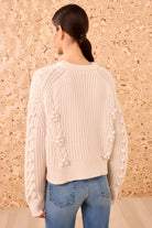 Arriving in warm alabaster white, the Indra Pullover is a timeless cozy sweater in wool and cashmere, alive with intricate cable motifs and embroidered knots.