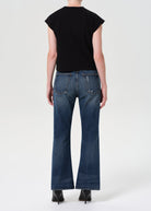 The ‘Kick Boot Ankle’ is a modern update to the classic bootcut, designed with a mid rise and ankle-skimming length. Cut from heavyweight rigid regenerative cotton, it balances structure with a soft hand for all-day wearability. Stencil, a dark indigo wash with subtle fading, marbling, and whiskering, lends a lived-in authenticity—perfect with everything from sharp tailoring to easy knits.