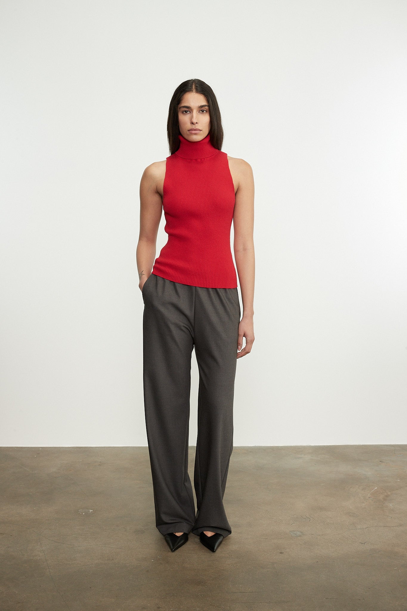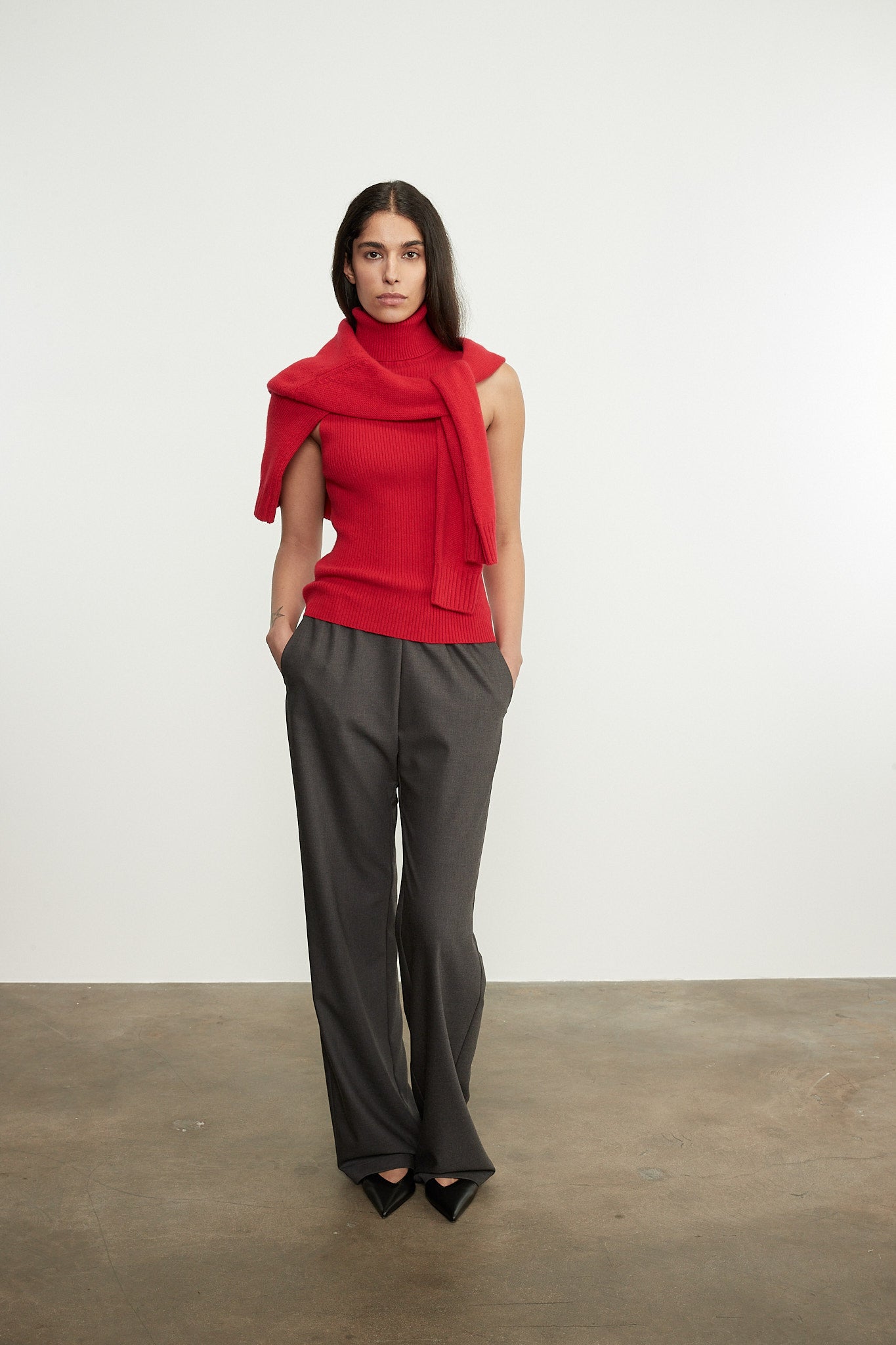 Knit sleeveless turtleneck in 100% cashmere. Medium-weight rib stitch.
