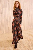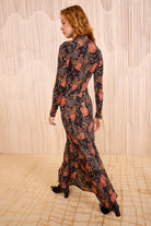 The Koa Dress is crafted from signature tricot jersey adored for its silky-soft feel, patterned with hyper-vibrant florals against a black backdrop. This multicolored dress has a ruched front that lightly sculpts, while the maxi silhouette enhances the form.
