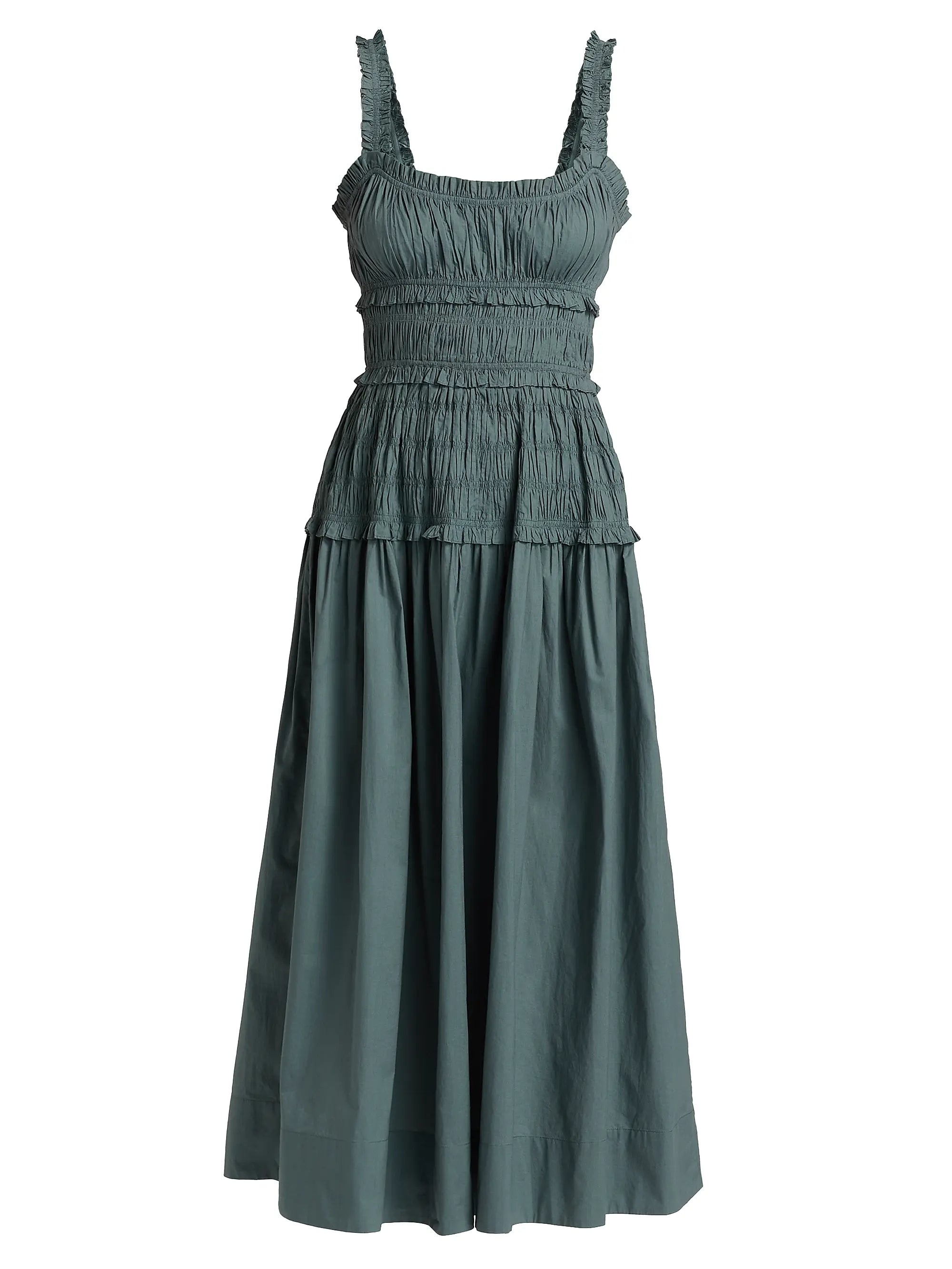Crafted of lightweight cotton, DÔEN's Marianne midi-dress showcases a tiered smocked bodice, scoopneck, and broad shoulder straps.