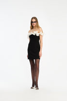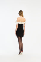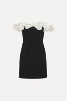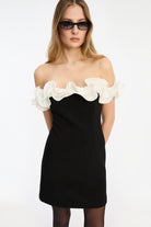 MINI RUFFLE DRESS BLACK IS A STRAPLESS MINI DRESS FEATURING A SCULPTED SILHOUETTE AND A SHORT LENGTH. THE NECKLINE IS ADORNED WITH A VOLUMINOUS, OFF-SHOULDER RUFFLE IN CONTRASTING WHITE, CREATING A BOLD, STRUCTURED DETAIL AROUND THE UPPER EDGE. THE DRESS HAS A CONCEALED ZIP CLOSURE AT THE BACK AND IS LINED.