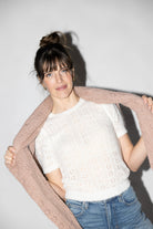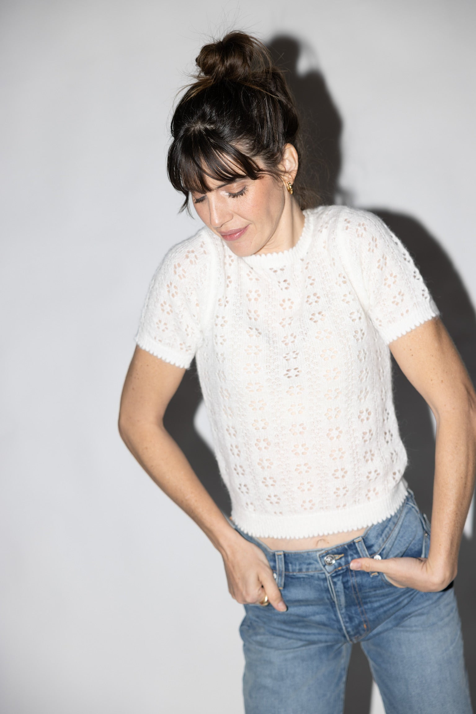 In a soft, slightly sheer blend of superfine alpaca and merino wool, the ‘60s-inspired Monica Sweater features a delicate allover pointelle design, short sleeves, and ribbing at the neckline, cuffs, and hem. Hitting slightly below the true waist, it can be layered or worn on its own.