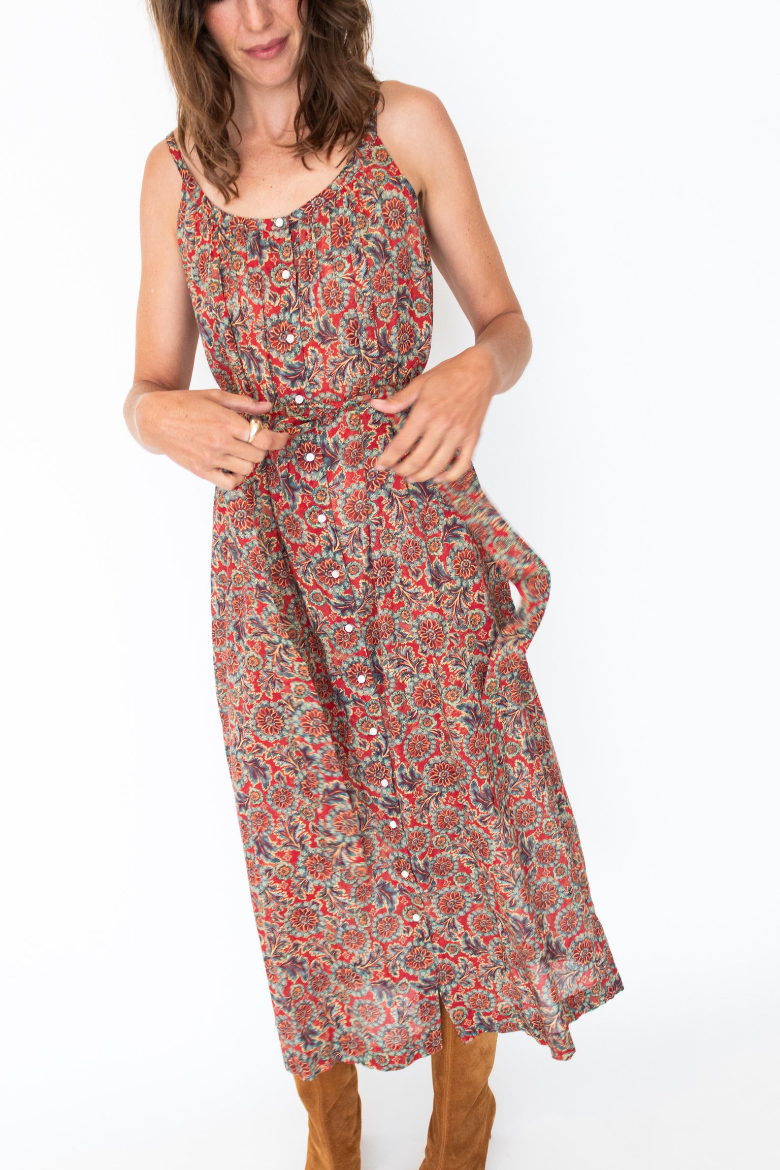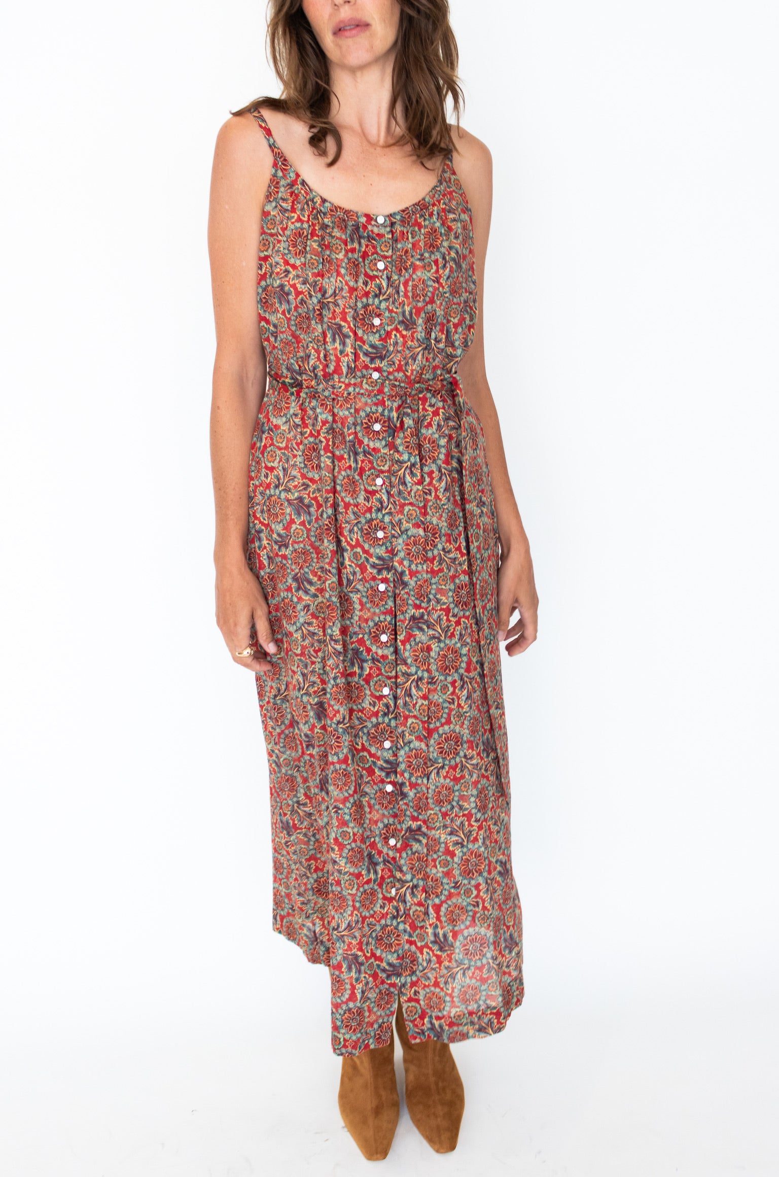 Light and breezy, the Nevita Dress is rendered in soft, organic cotton voile adorned with our Soleil Fleurit print—a motif inspired by an antique French block-printed quilt sourced by our co-founder Katherine. It features a gathered scoop neckline, slender straps, and a breezy silhouette with an adjustable waist tie. Mother-of-pearl buttons extend down the front.