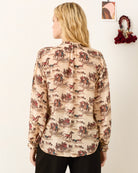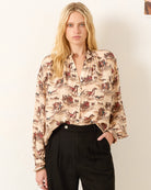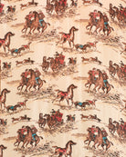 Individually cut by hand, our cotton-silk blend shirt has a ruffled collar and cuffs, a mother-of-pearl button front, and dramatically gathered sleeves. The Western-inspired shirt features a tableau of cowboys in a desert landscape.