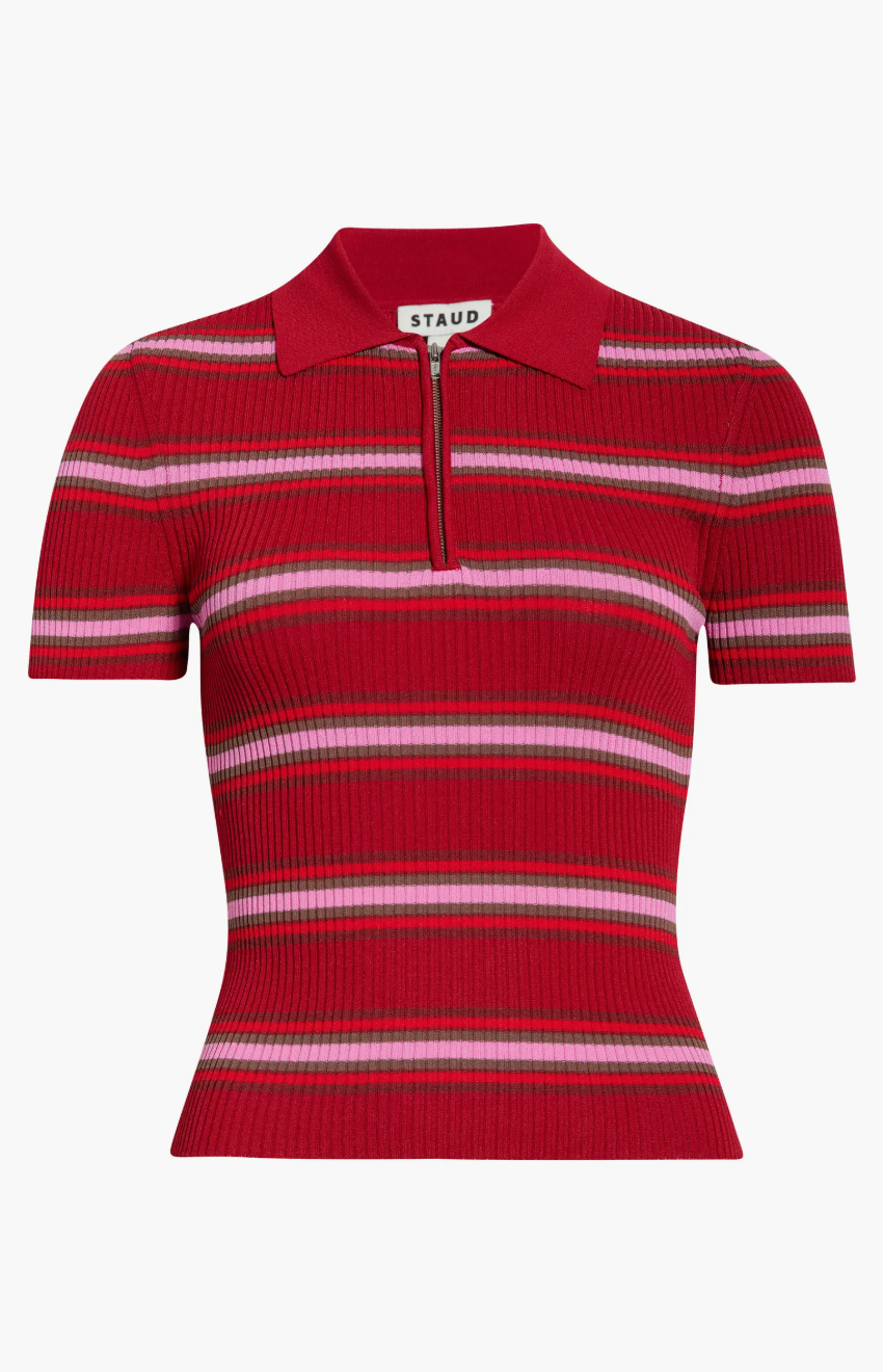 Tailored knit polo featuring a classic redondo stripe pattern. Short sleeves and a fitted silhouette create a polished, versatile piece perfect for layering or wearing solo.
