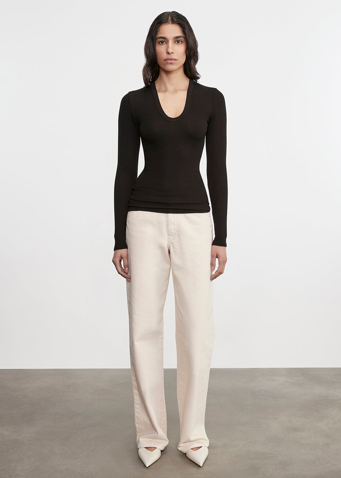 A slim long-sleeved U-neck in our best-selling silk rib fabric. Soft and luxurious, this piece is perfect for layering or on its own.