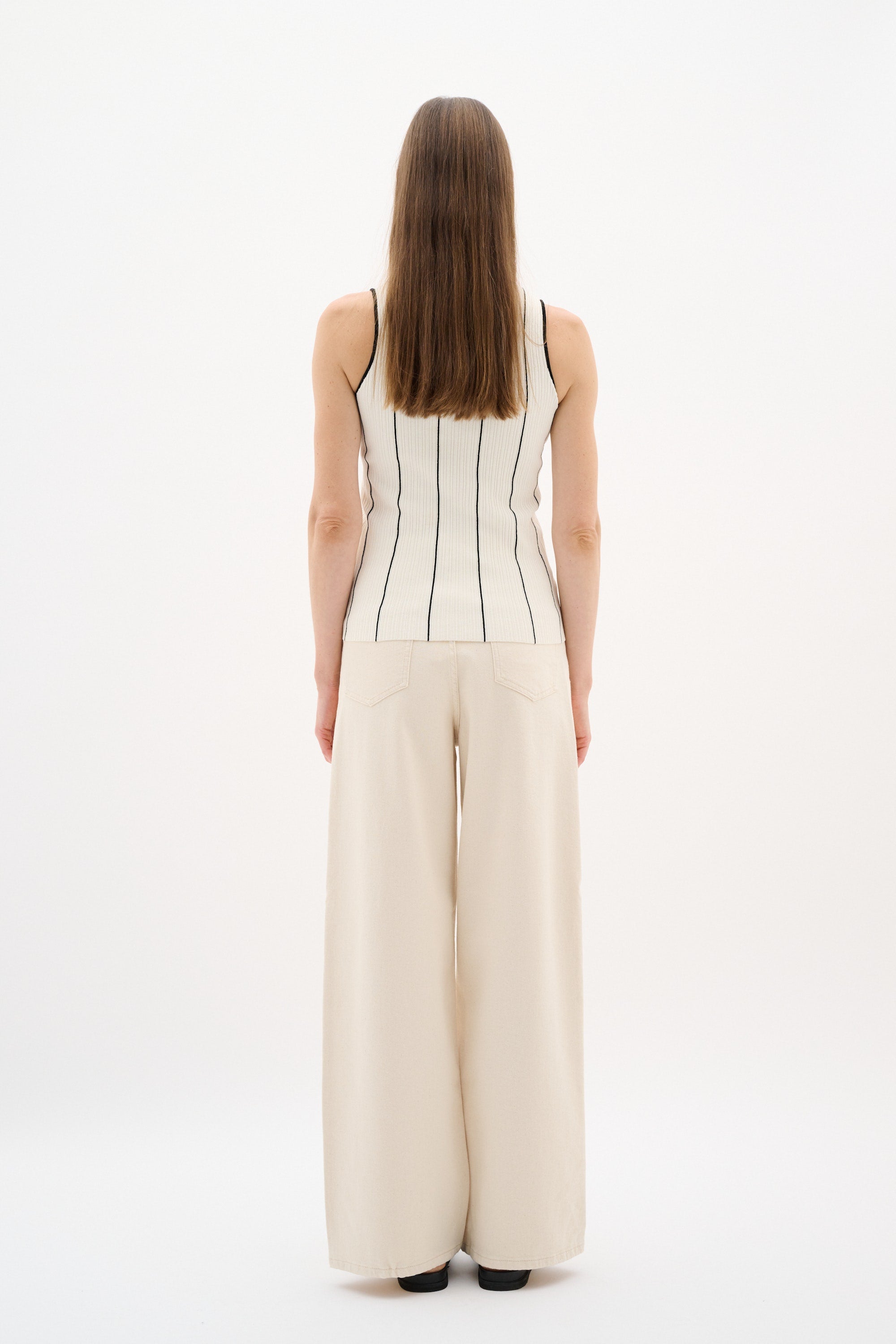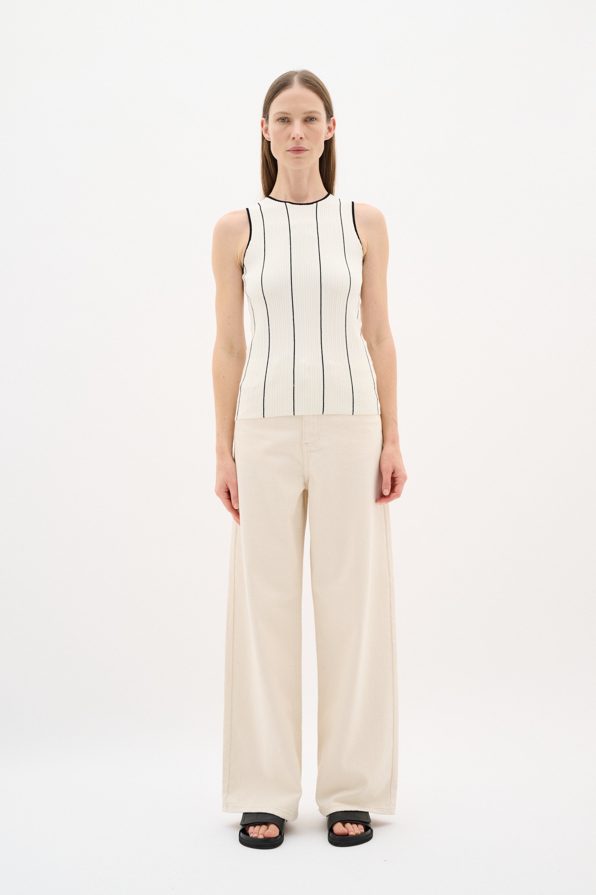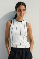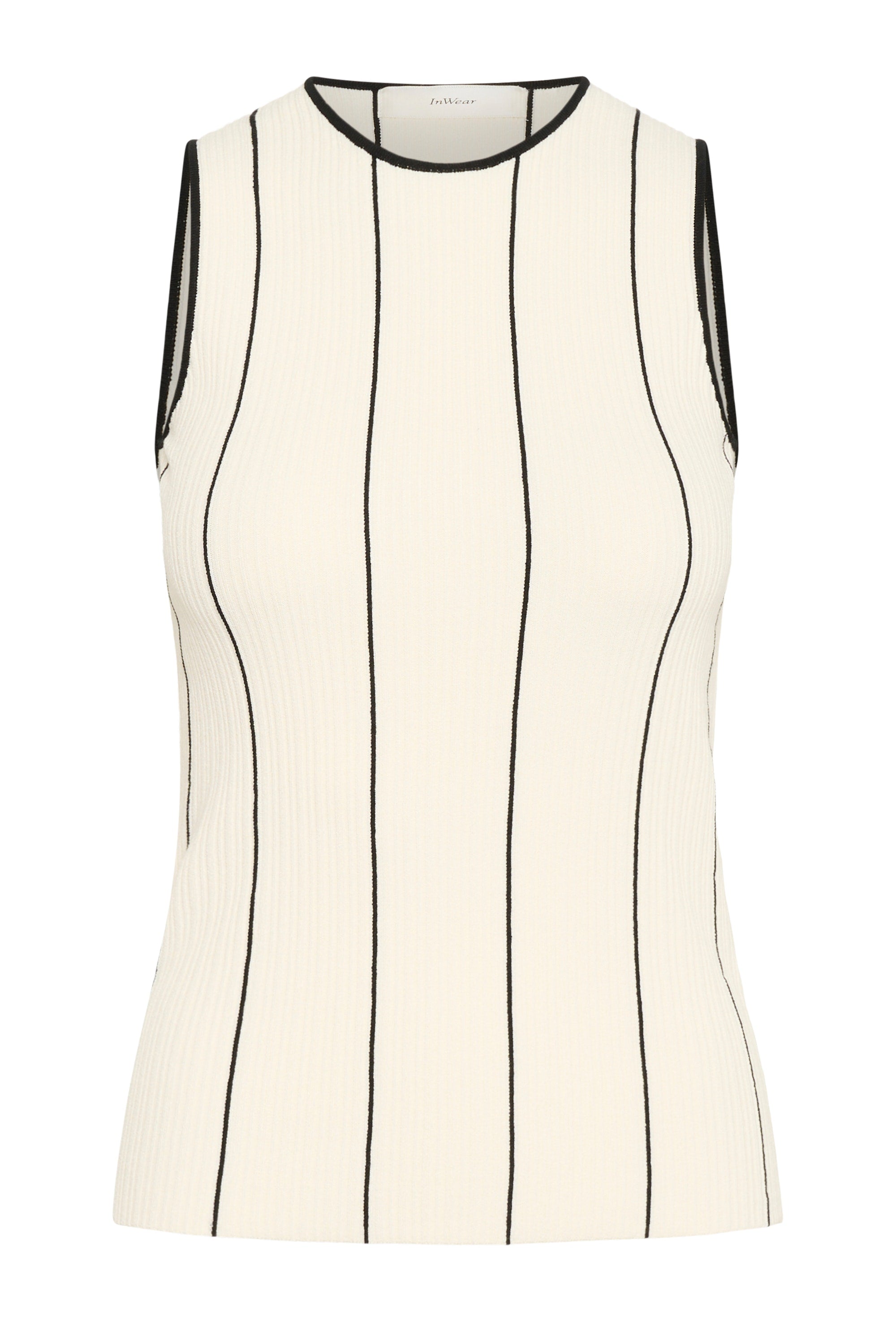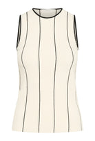 Sleeveless ribbed top in ivory with black vertical stripes and contrasting trim. Designed with a close fit and round neckline, combining a timeless look with modern detailing. The stretchy fabric ensures comfort and ease of movement.