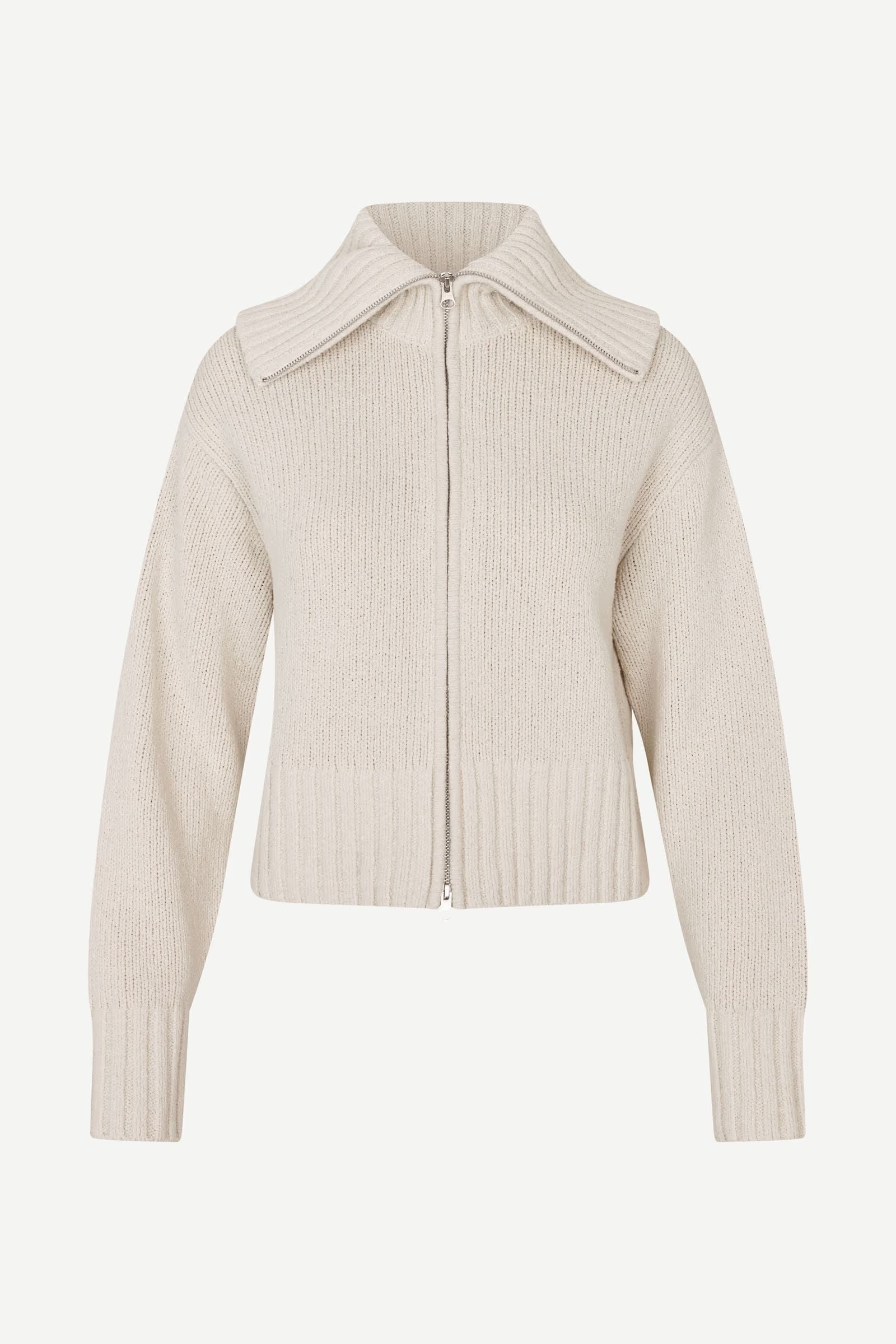 Cardigan with a zip closure on the front. Main material made from a blend of organic cotton and recycled polyamide.