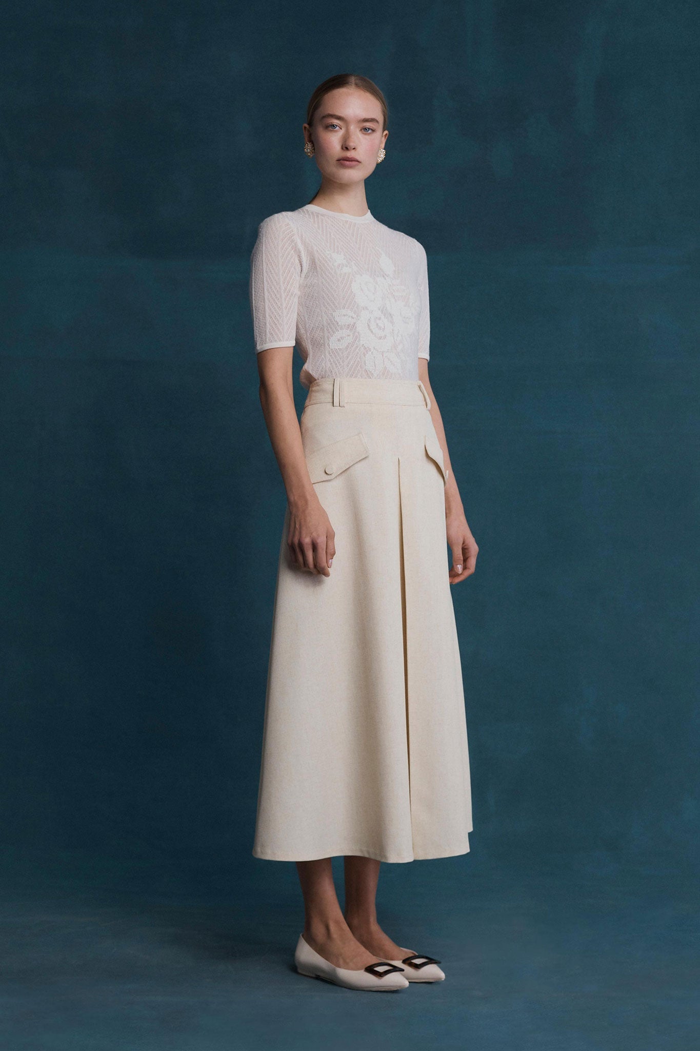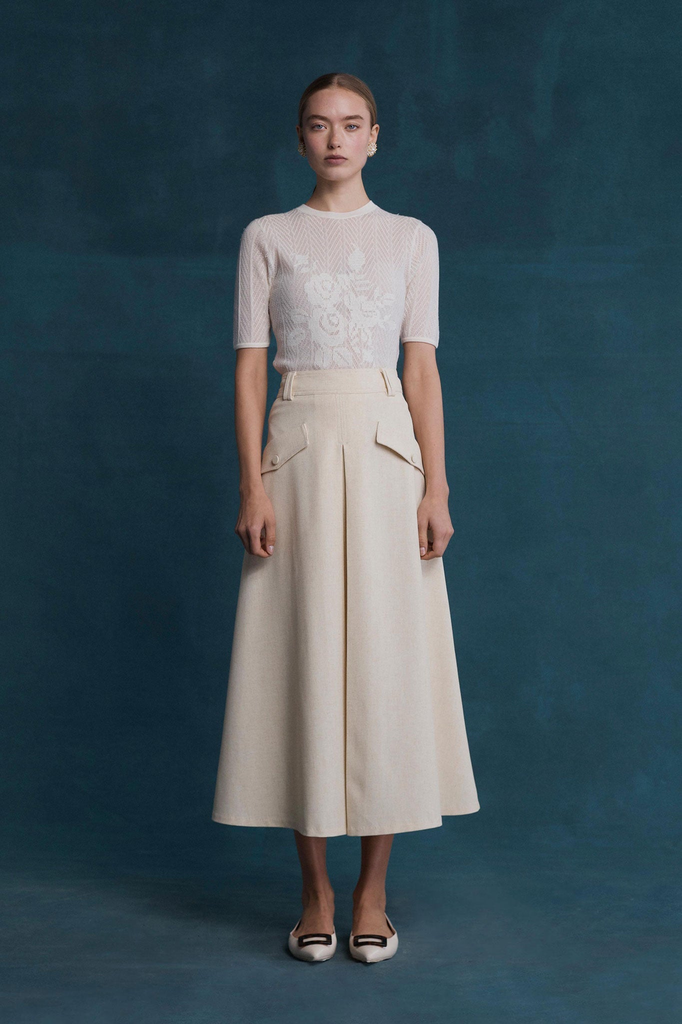 The Sally tee in white blends effortless dressing with modern sophistication. Made from delicate and soft wool blended yarn and adorning a floral motif across the front of the tee, pair with your favourite mini skirt or jeans, fit for any occasion.