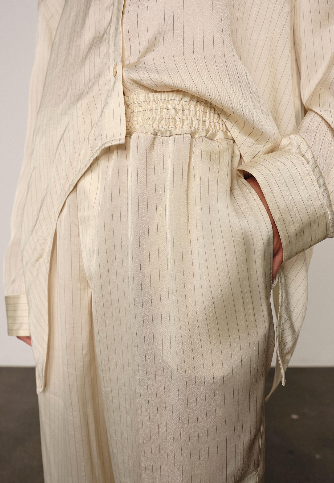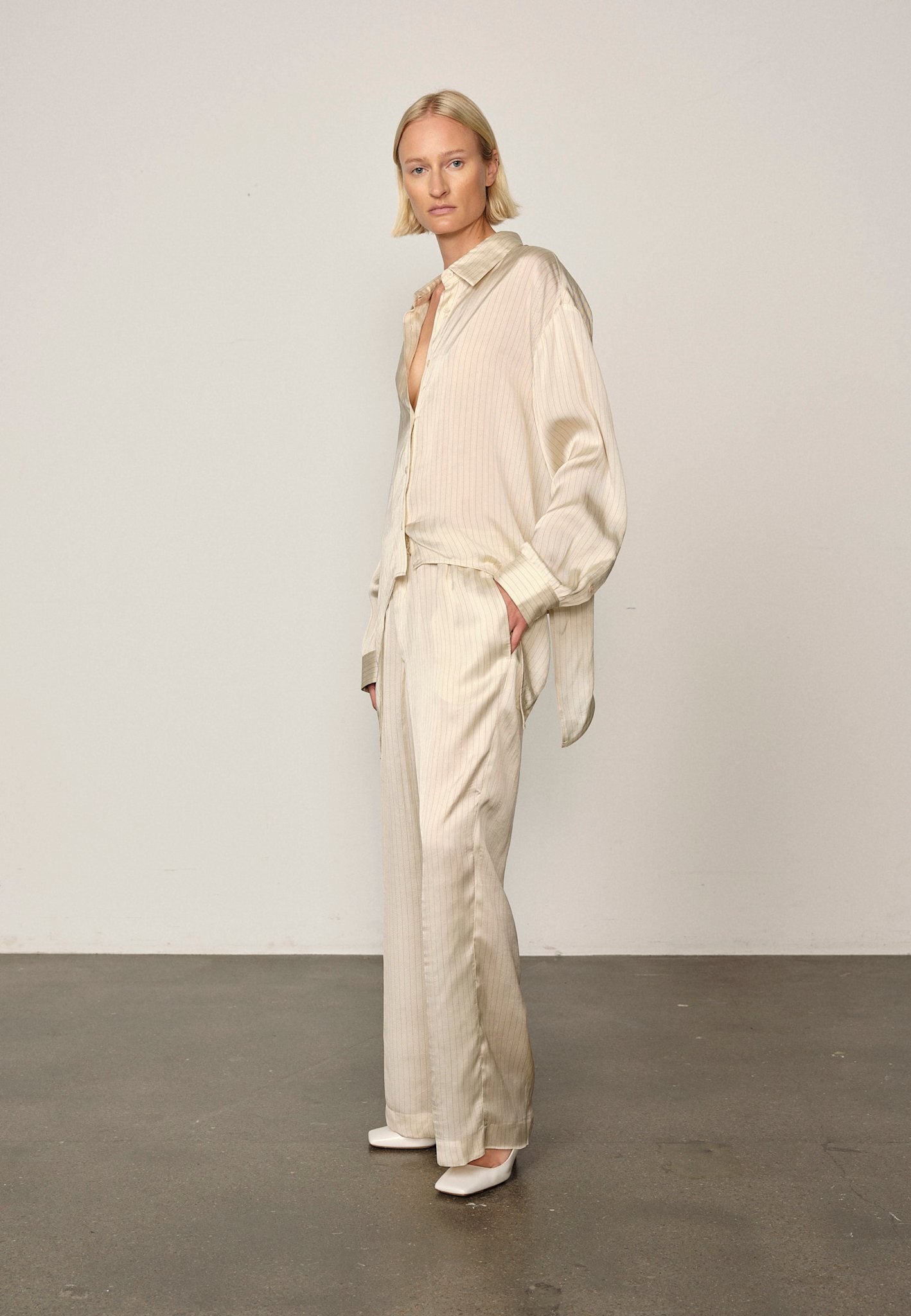 Tailored trousers in a lustrous silk–FSC viscose blend. A refined match to the Enrico Shirt. The trousers are offering a soft drape and natural sheen. Designed with a relaxed, fluid silhouette, they feature a comfortable elastic waistband and pressed pleats through the front for a tailored finish. Effortless yet refined — ideal for both laid-back and elevated styling.