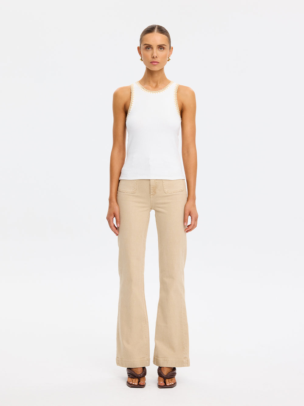 A modern essential, our signature Tallulah Spliced Tank is cut from a premium rib knit featuring a high neckline accented with contrast tan, hand-crocheted detailing adding an artisanal touch. Wear with denim or linen separates for easy daytime dressing, or elevate with tailored pants and sandals for a refined, minimalist look.